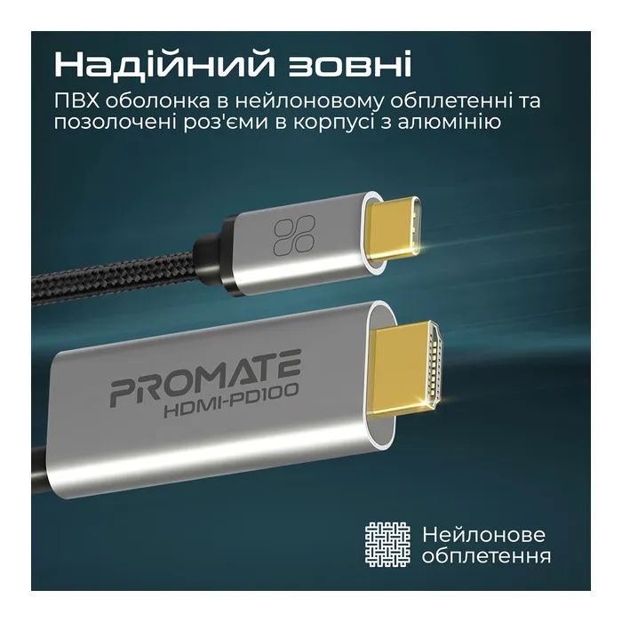 Кабель мультимедійний USB-C to HDMI M 1.8m + USB-CF grey Promate (hdmi-pd100.grey)