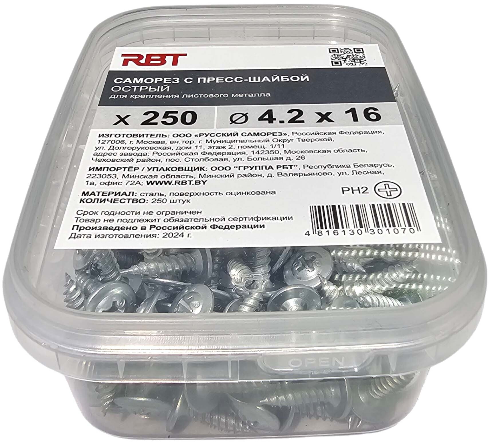 Саморез RBT СПШО/Ц 4.2х16 с прессшайбой острый мелкий шаг (250шт, оцинкованный)