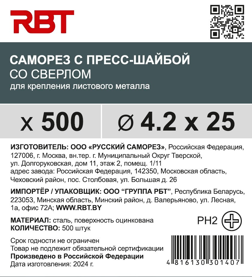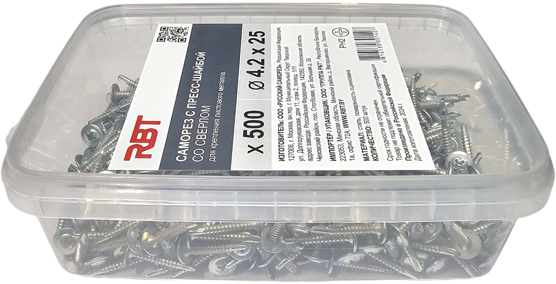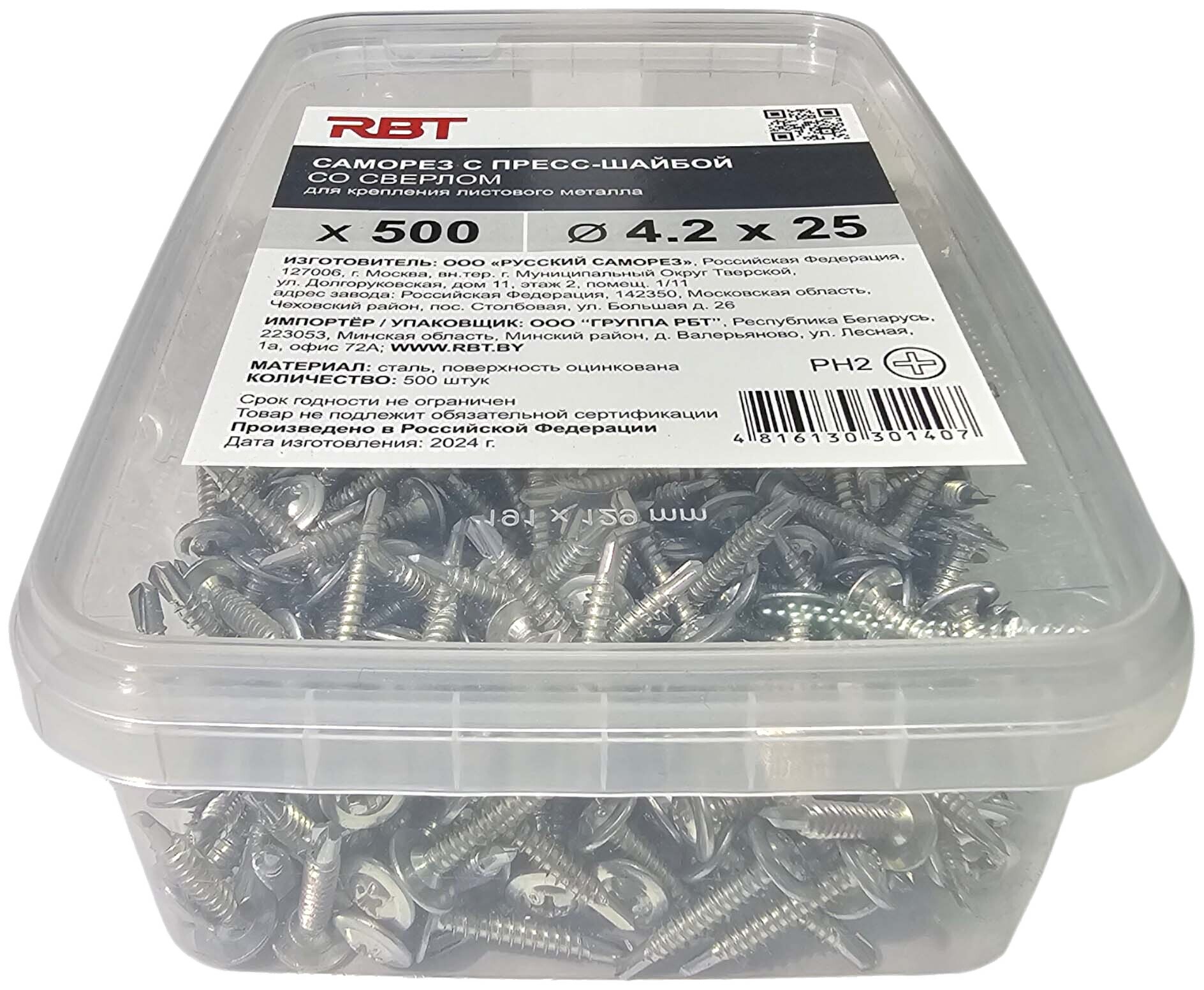 Саморез RBT СПШС/Ц 4.2х25 с прессшайбой со сверлом мелкий шаг (500шт, оцинкованный)