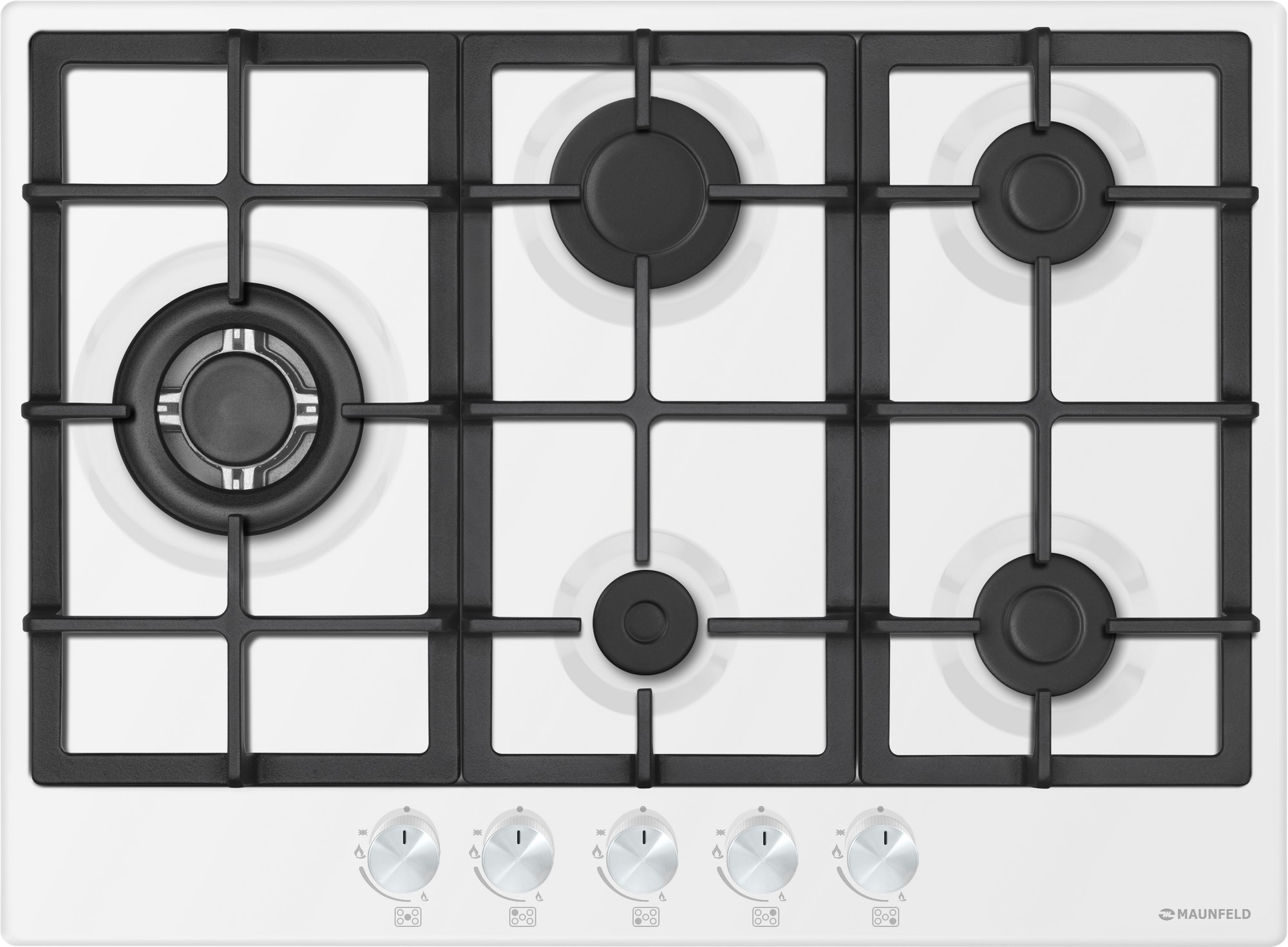 Газовая варочная панель MAUNFELD/ Газовая варочная панель MAUNFELD EGHE.75.33CW/G, механическое управление, 5 конфорок, мощность конфорок 1000, 1700, 1700, 2600, 3800, электроподжиг, газ-контроль, WOK, цвет белый/стальной