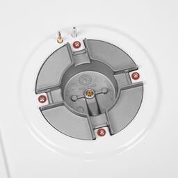 Панель выполнена из нержавеющей стали, покрытой термостойкой прочной эмалью белого цвета. В данной модели установлены высококачественные итальянские горелки SABAF. Четыре стандартные конфорки разного диаметра мощностью 1000 Вт, 1700 Вт, 1700 Вт, 2600 Вт и 1 сверхмощная WOK-конфорка с двойным пламенем мощностью 3800 Вт, расположенная на левой части панели.