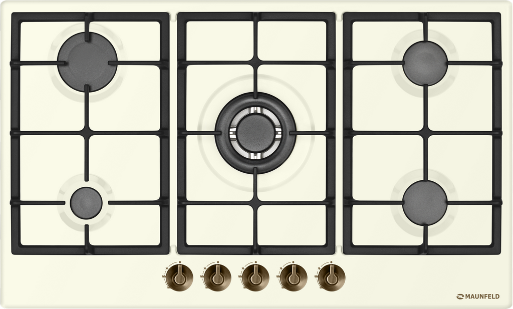 Газовая варочная панель MAUNFELD/ Газовая варочная панель MAUNFELD EGHE.95.33CBG.R/G, механическое управление, 5 конфорок, мощность конфорок 1000, 1700, 1700, 2600, 3800, электроподжиг, газ-контроль, WOK, цвет бежевый/состаренная бронза