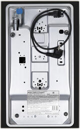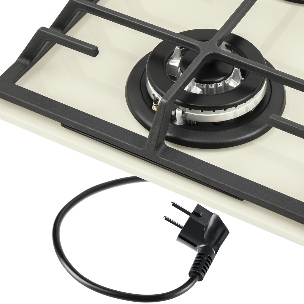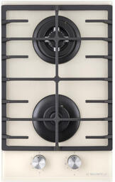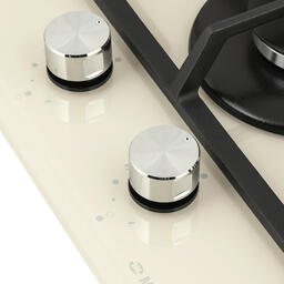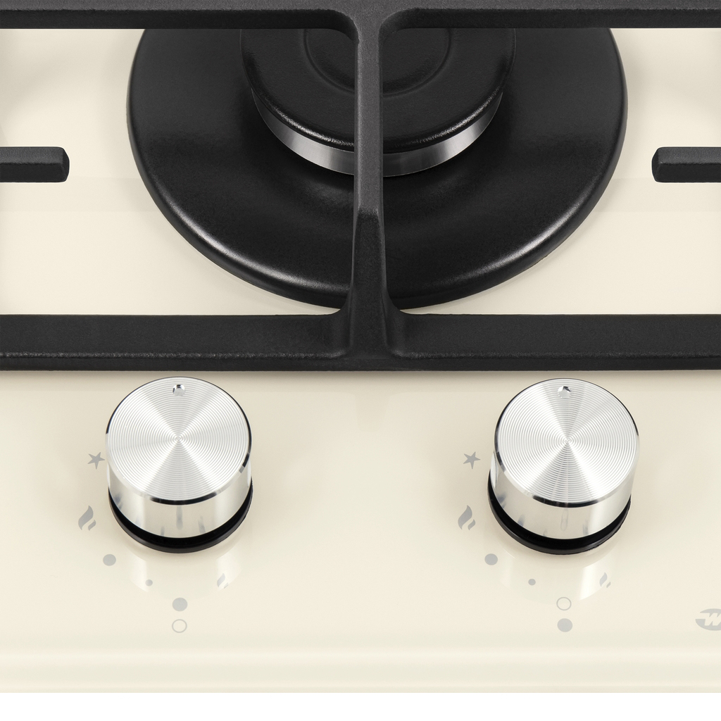 Панель бежевого цвета выполнена из закаленного стекла толщиной 8 мм от немецкого производителя Schott. В данной модели установлены высококачественные итальянские горелки «Sabaf». Одна стандартная конфорка мощностью 1700 Вт и одна WOK-конфорка с двойным пламенем мощностью 3000 Вт.