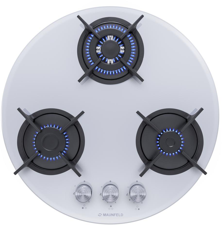 Газовая варочная панель MAUNFELD/ Газовая варочная панель MAUNFELD EGHG.43.23CW/G, механическое управление, 3 конфорки, мощность конфорок 1200, 1700, 3500, электроподжиг, газ-контроль, WOK, цвет белый/нержавеющая сталь