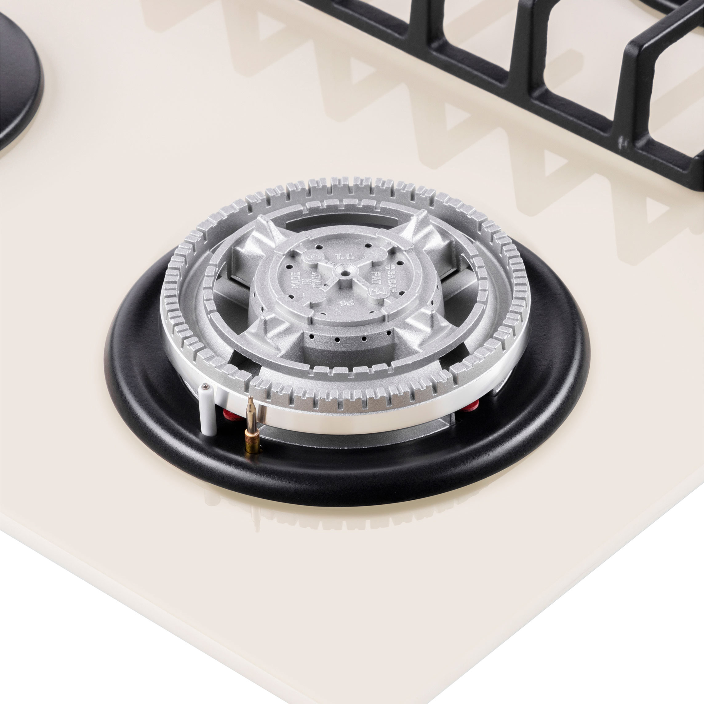 Панель выполнена из закаленного стекла бежевого цвета. В данной модели установлены высококачественные итальянские горелки SABAF. Три стандартные конфорки мощностью 1700 Вт, 1700 Вт, 1000 Вт и одна WOK-конфорка с двойным пламенем мощностью 3800 Вт.