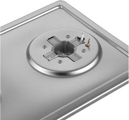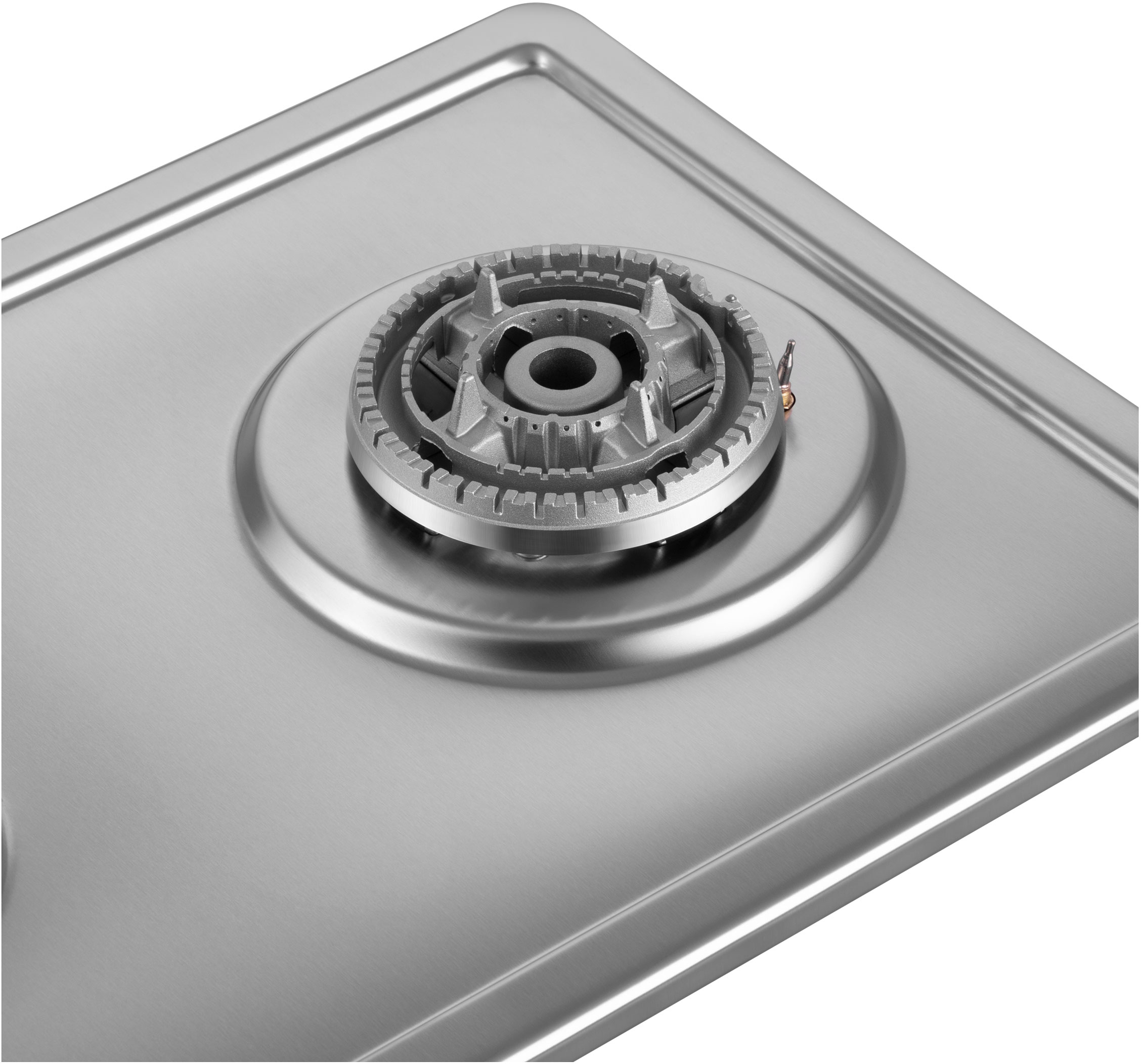Панель выполнена из нержавеющей стали. В данной модели установлены высококачественные итальянские горелки «Sabaf». Одна стандартная конфорка мощностью 1700 Вт и одна WOK-конфорка двойным пламенем3000 Вт. Чугунная решетка имеет крестообразные соединения над конфорками, что позволяет готовить в посуде разного диаметра, не используя специальные подставки.