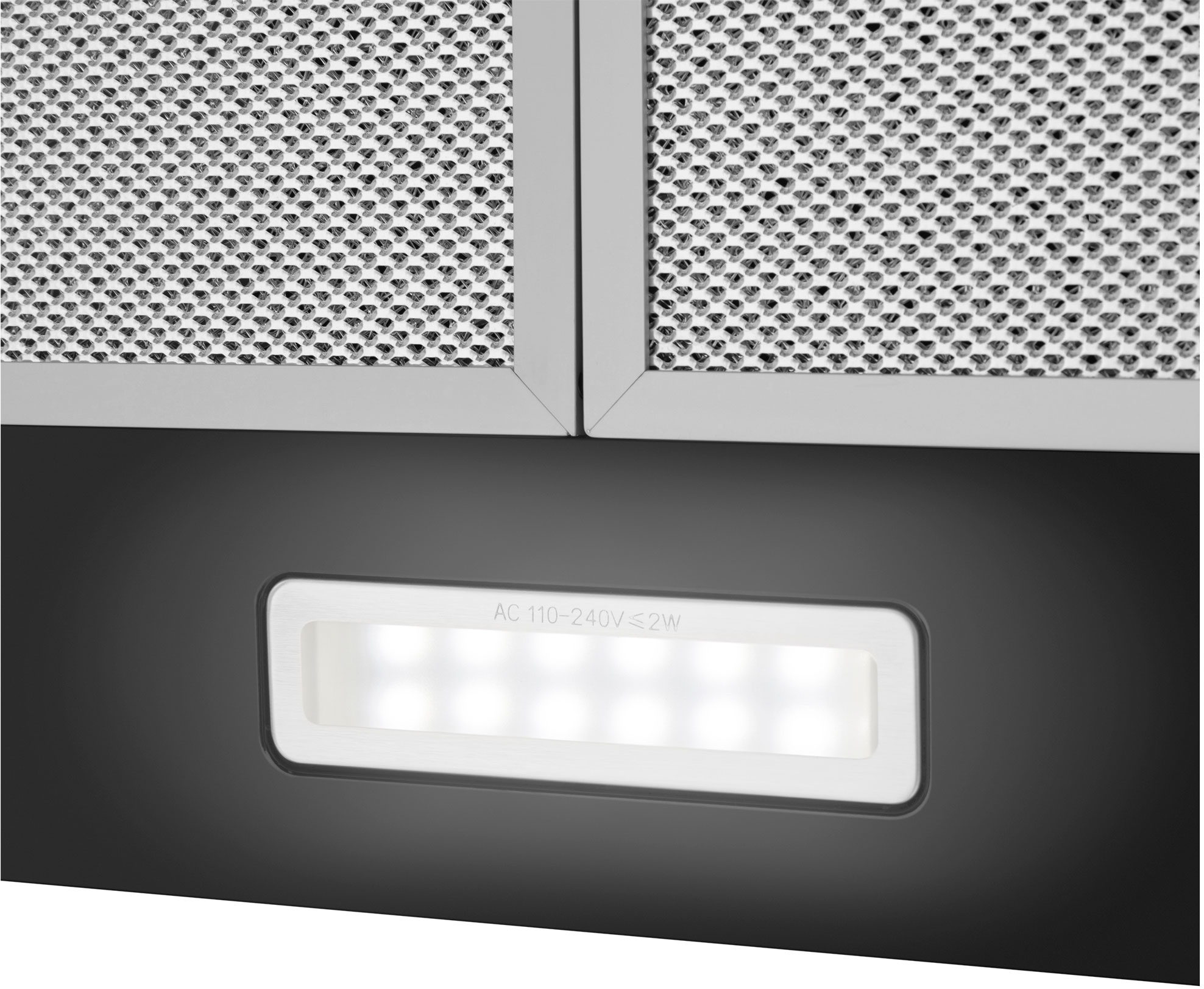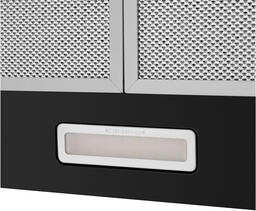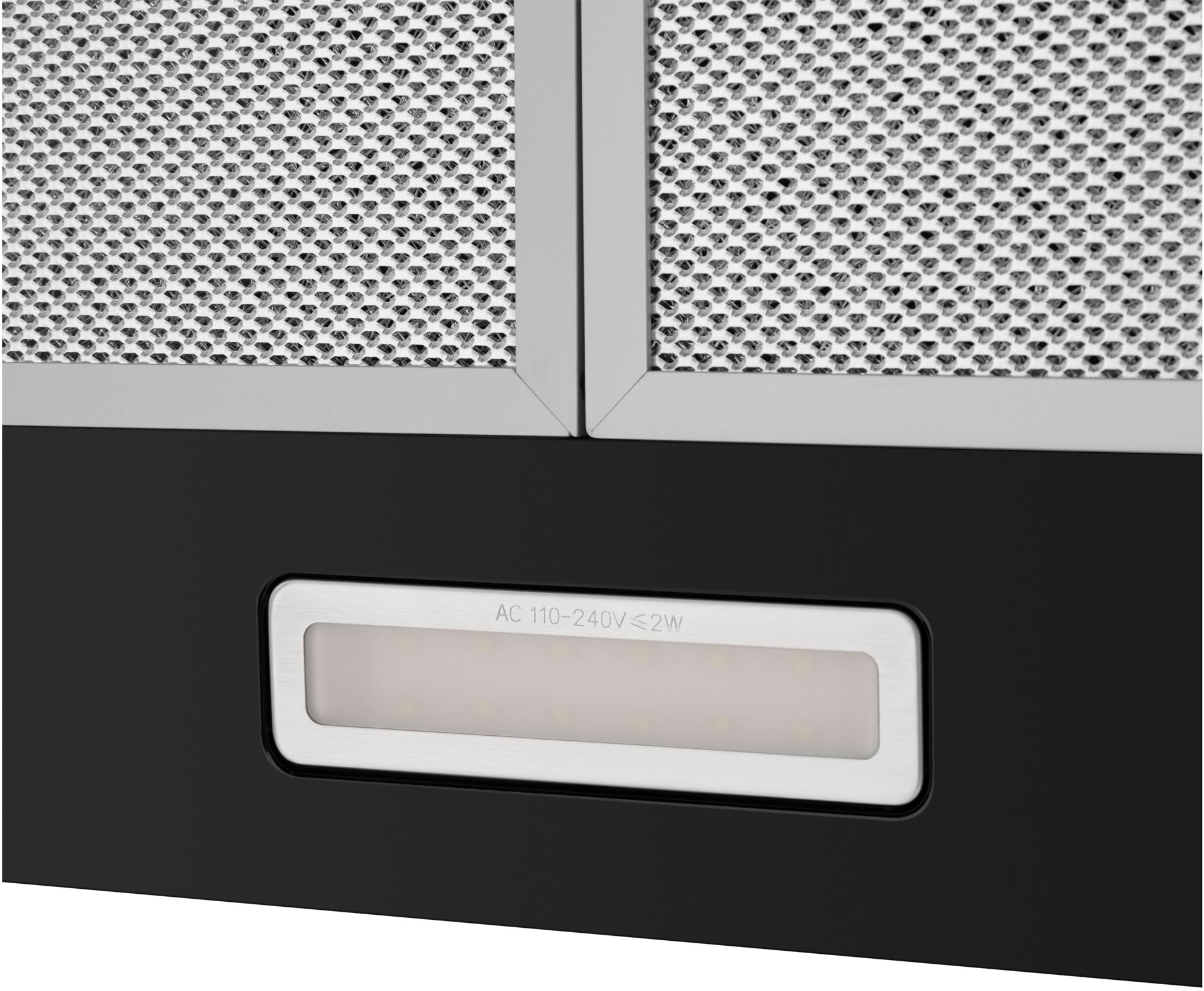 Вытяжка выполнена из нержавеющей стали с эмалевым покрытием черного цвета. Большая площадь рабочей зоны, состоящей из двух многослойных жироулавливающих фильтров, позволяет эффективно захватывать загрязненный воздух на кухне большой площади (до 20 кв.м). Фильтры легко снимаются и в случае необходимости очистки полностью разбираются.