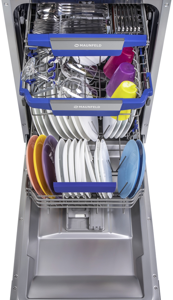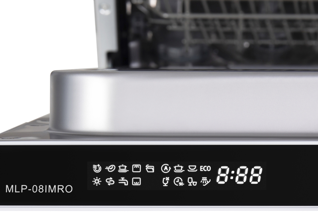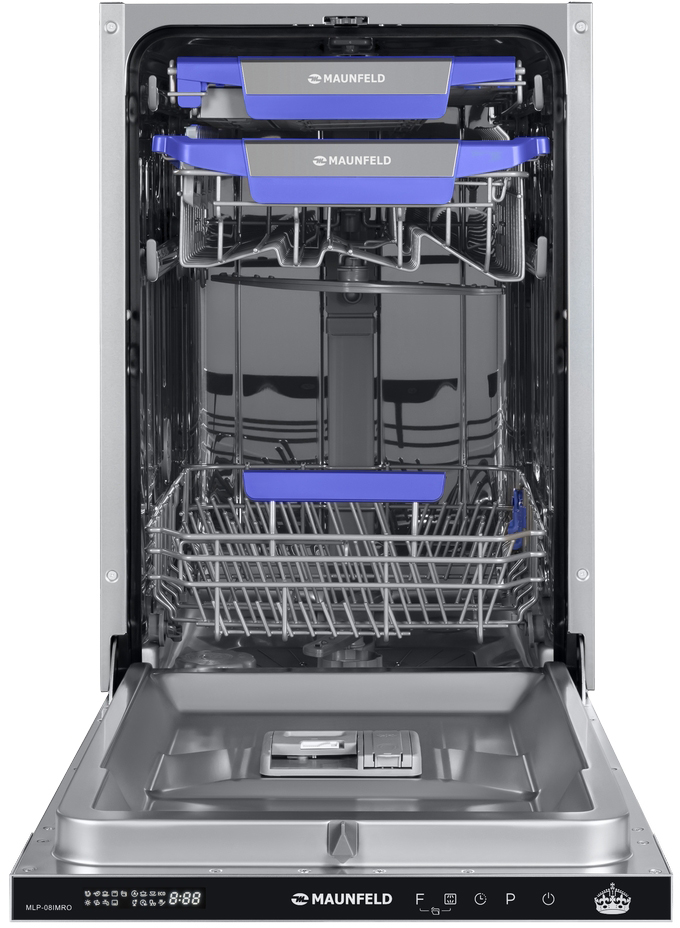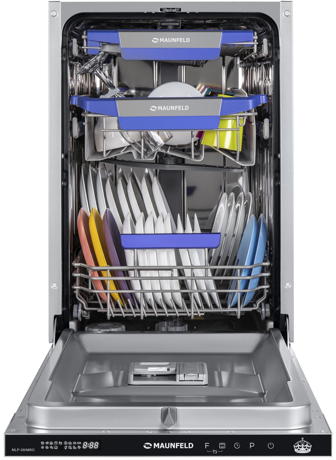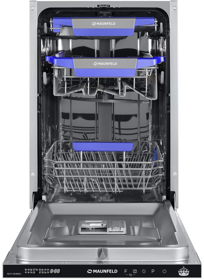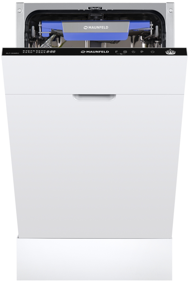 Посудомоечная машина MAUNFELD/ Посудомоечная машина MAUNFELD MLP-08IMRO, встраиваемая 45 см, вместимость 10 комплектов, 8 программ, луч на полу, дисплей, режим 1/2 загрузки, третий уровень загрузки, автоматическое открывание двери, отсрочка старта, аквастоп, внутреннее освещение, конденсационная сушка, сенсорное управление, энергоэффективность А++, цвет нержавеющая сталь