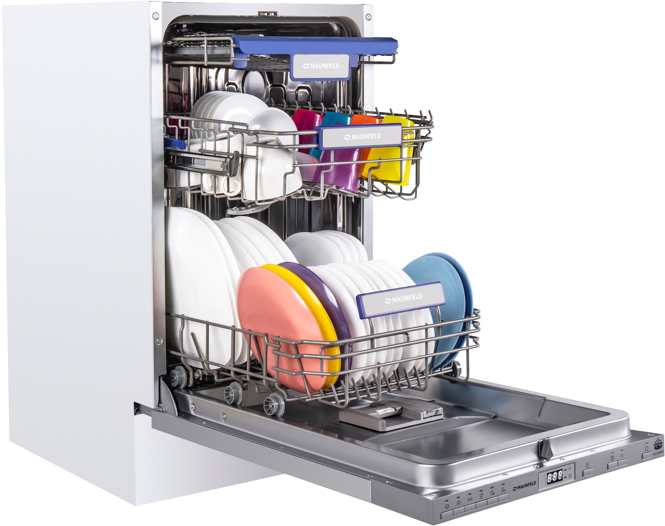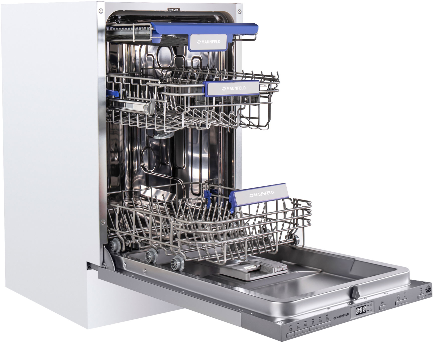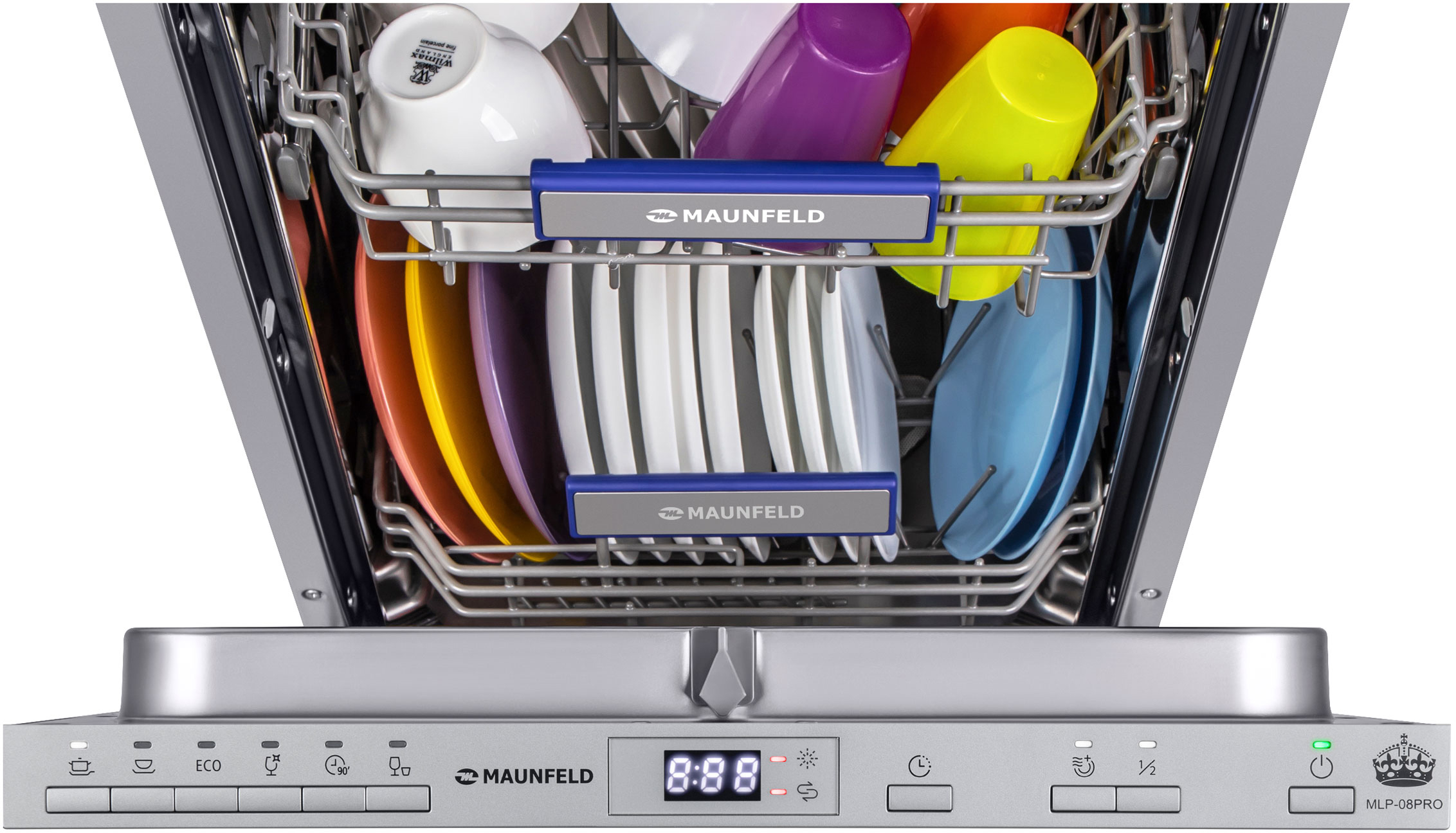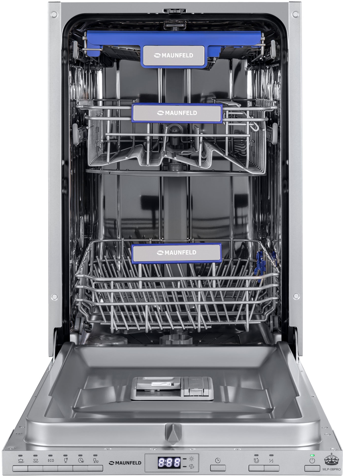 Посудомоечная машина MAUNFELD/ Посудомоечная машина MAUNFELD MLP-08PRO, встраиваемая 45 см, вместимость 10 комплектов, 8 программ, луч на полу, дисплей, режим 1/2 загрузки, третий уровень загрузки, отсрочка старта, аквастоп, внутреннее освещение, конденсационная сушка, кнопочное управление, энергоэффективность А++, цвет нержавеющая сталь