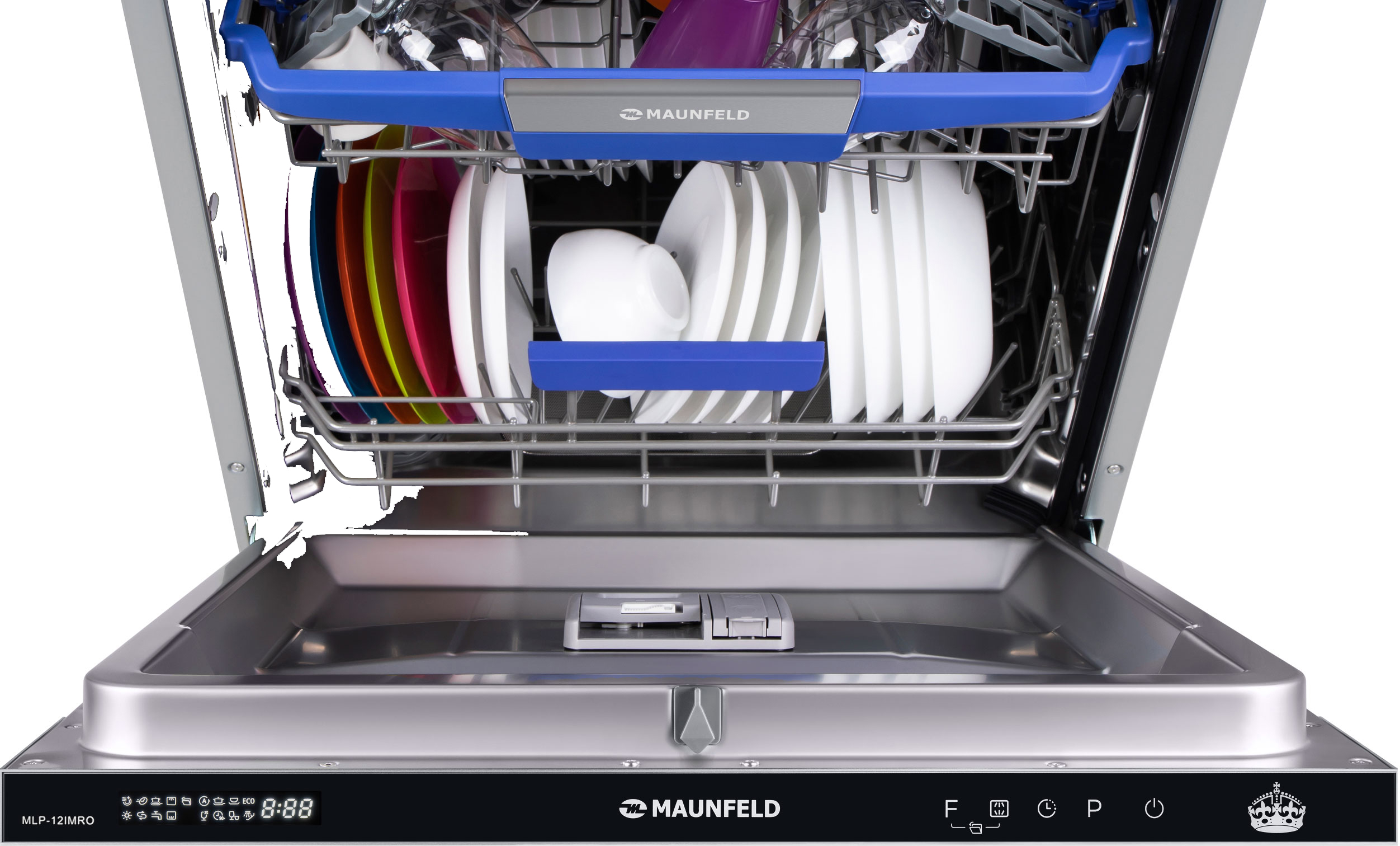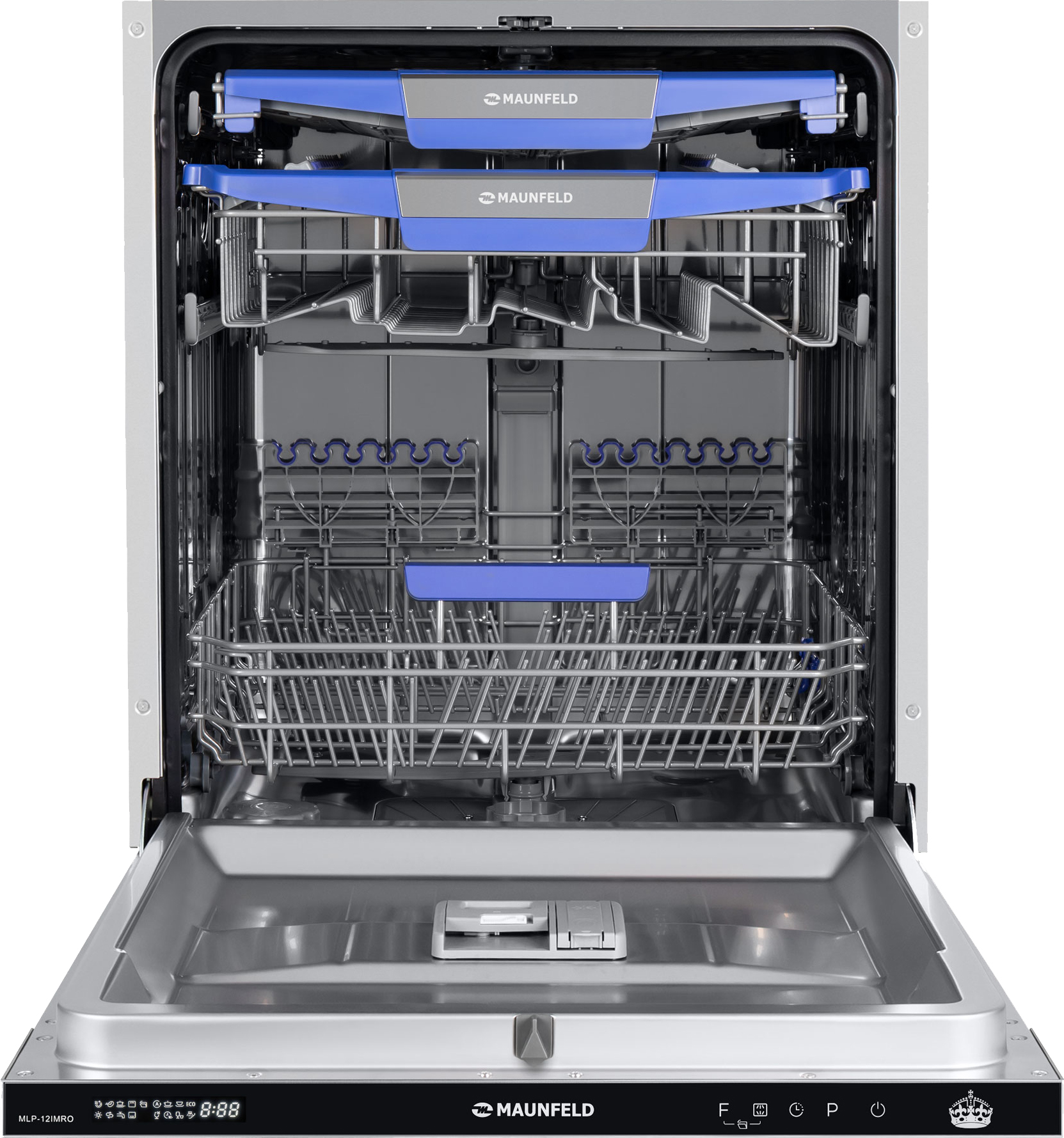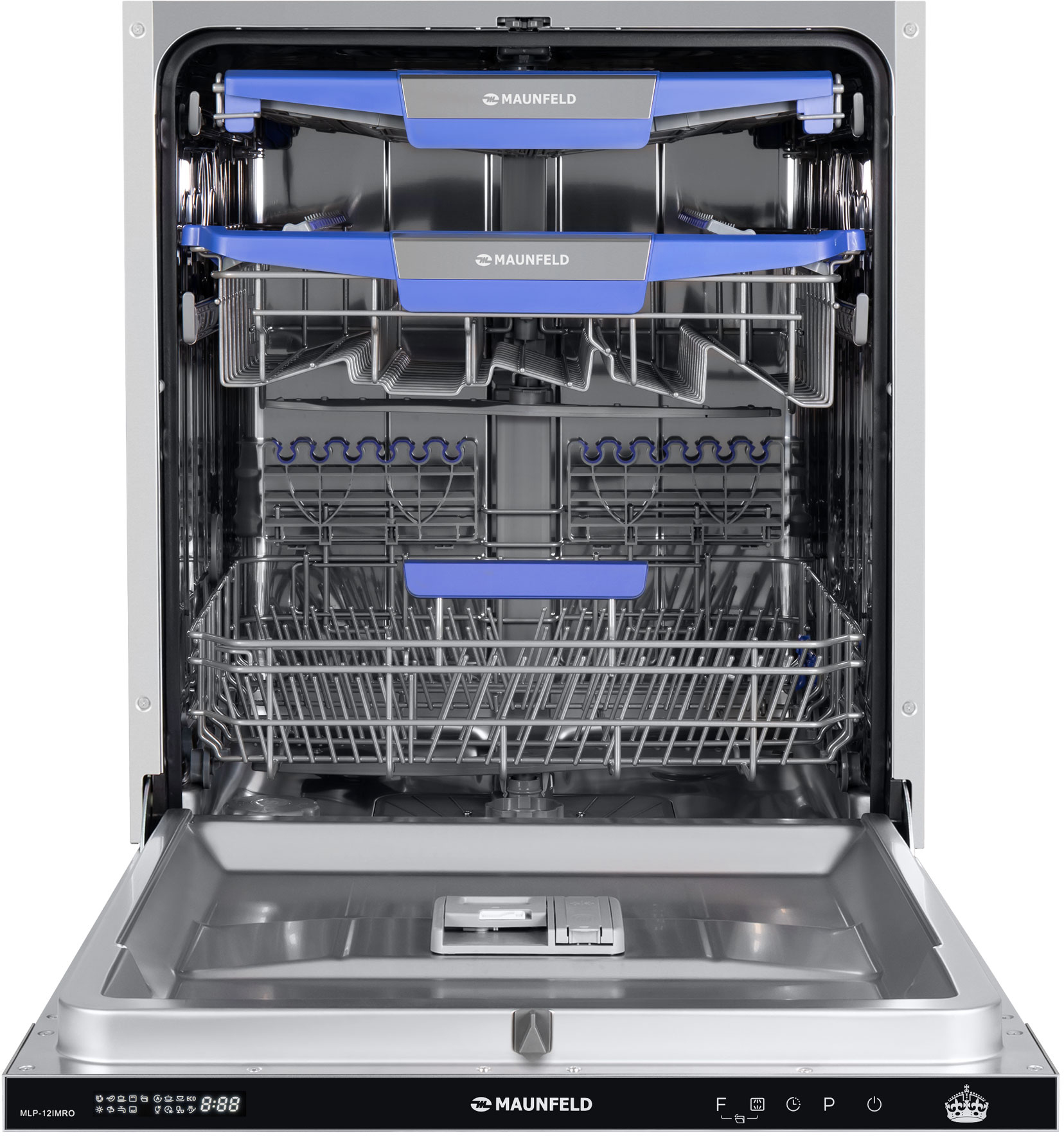 Посудомоечная машина MAUNFELD/ Посудомоечная машина MAUNFELD MLP-12IMRO, встраиваемая 60 см, вместимость 14 комплектов, 8 программ, луч на полу, дисплей, режим 1/2 загрузки, третий уровень загрузки, автоматическое открывание двери, отсрочка старта, аквастоп, внутреннее освещение, конденсационная сушка, сенсорное управление, энергоэффективность А++, цвет нержавеющая сталь