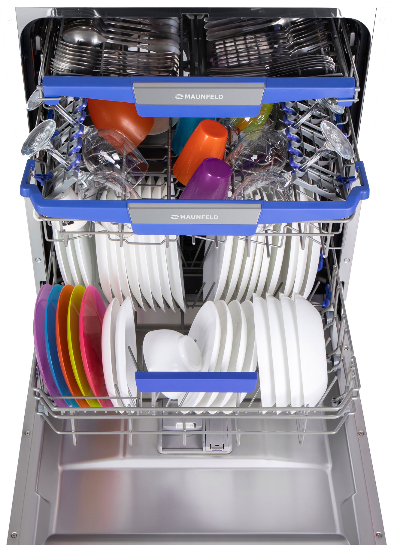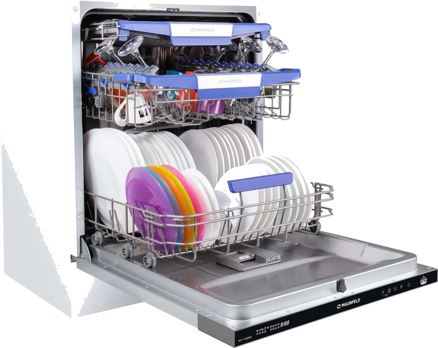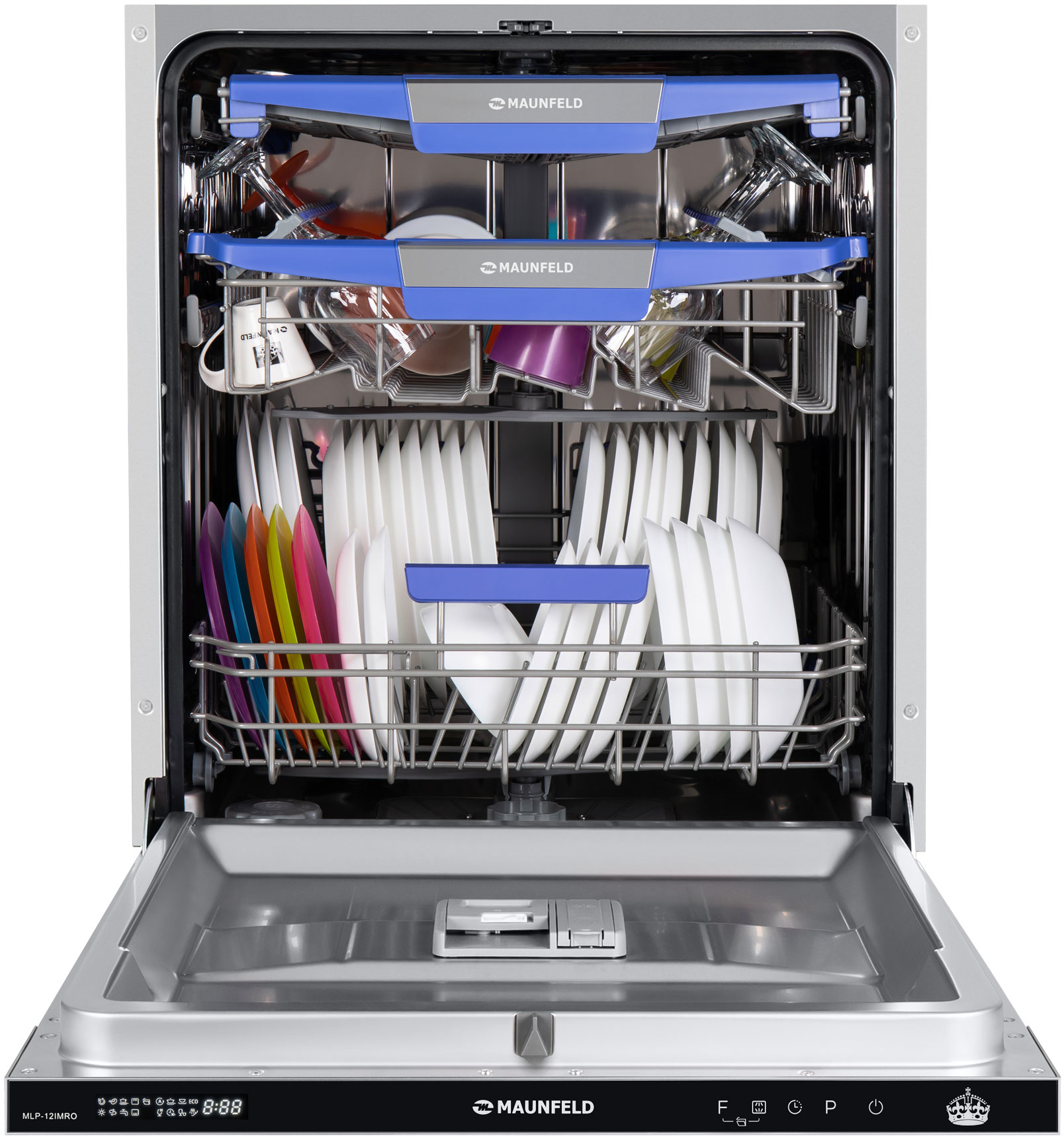 Посудомоечная машина MAUNFELD/ Посудомоечная машина MAUNFELD MLP-12IMRO, встраиваемая 60 см, вместимость 14 комплектов, 8 программ, луч на полу, дисплей, режим 1/2 загрузки, третий уровень загрузки, автоматическое открывание двери, отсрочка старта, аквастоп, внутреннее освещение, конденсационная сушка, сенсорное управление, энергоэффективность А++, цвет нержавеющая сталь