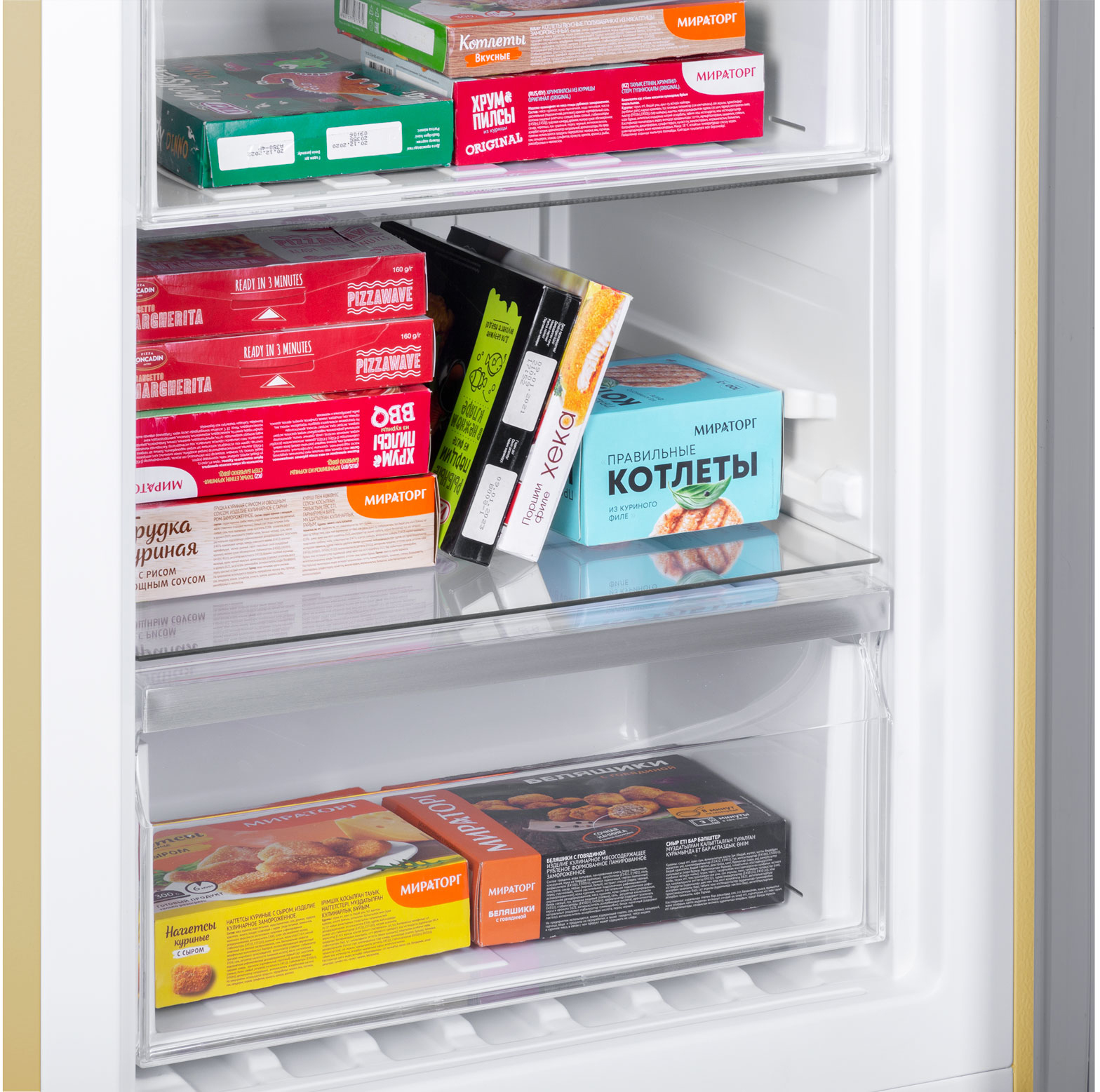 Система охлаждения всего холодильника - «No Frost». При использовании данной технологии, холодный сухой воздух равномерно распределяется при помощи вентилятора по всей камере. Благодаря этому на продуктах и внутренних поверхностях прибора не образовывается иней. Теперь вам никогда не придется размораживать холодильник.
