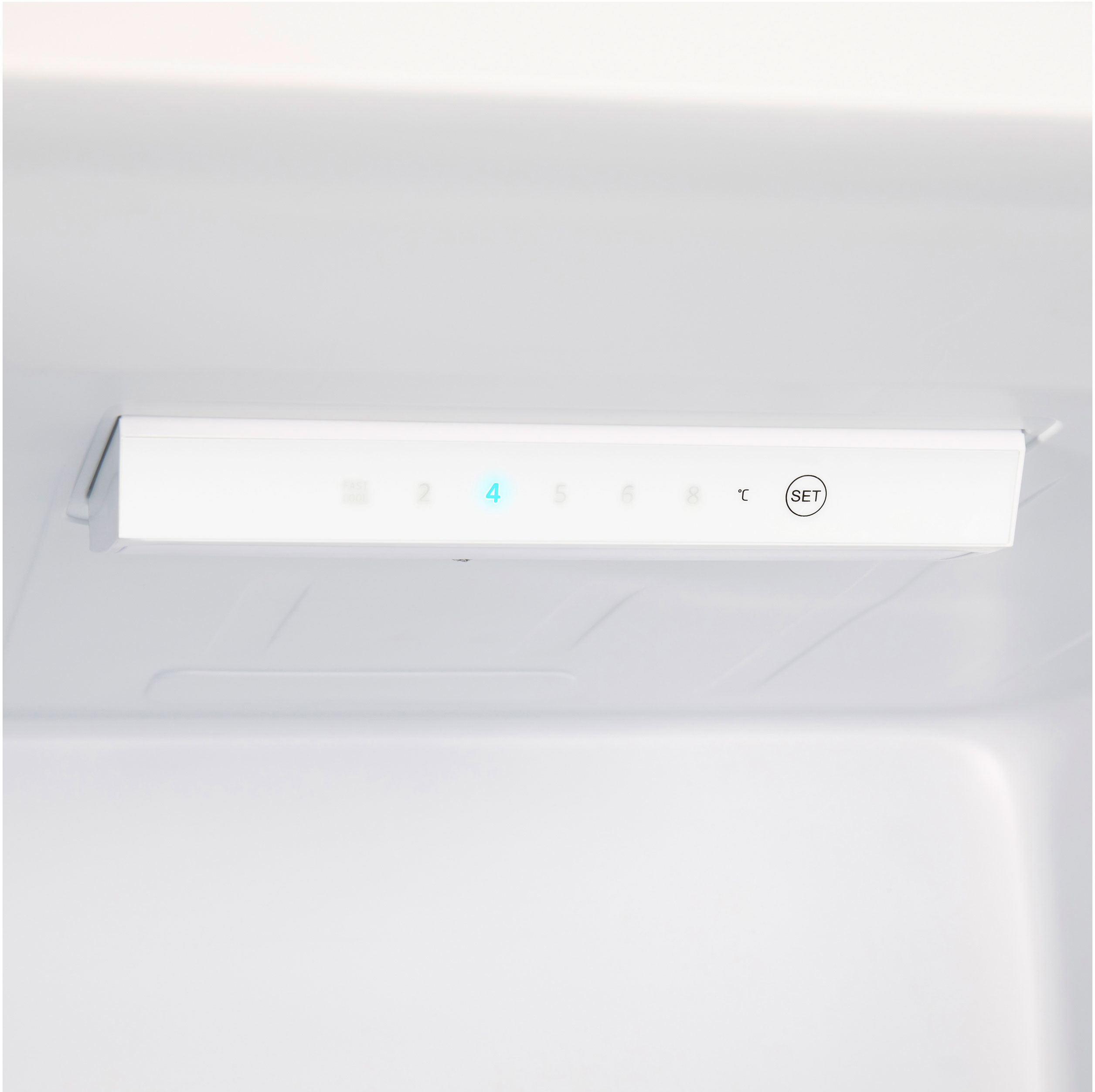 Кнопки выбора температуры (+2°C до +8°C) и быстрого охлаждения морозильной камеры находятся на дисплее в верхней части холодильника.