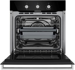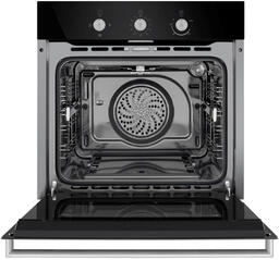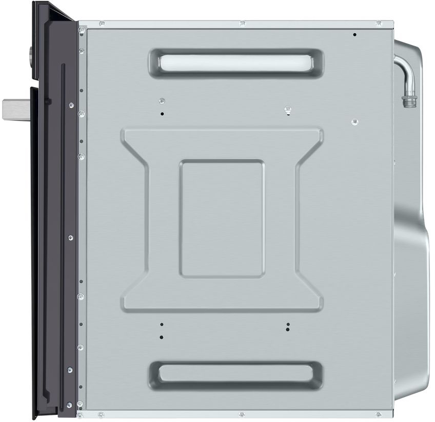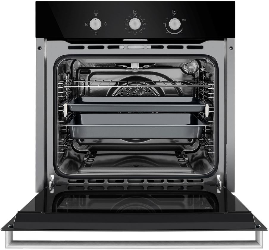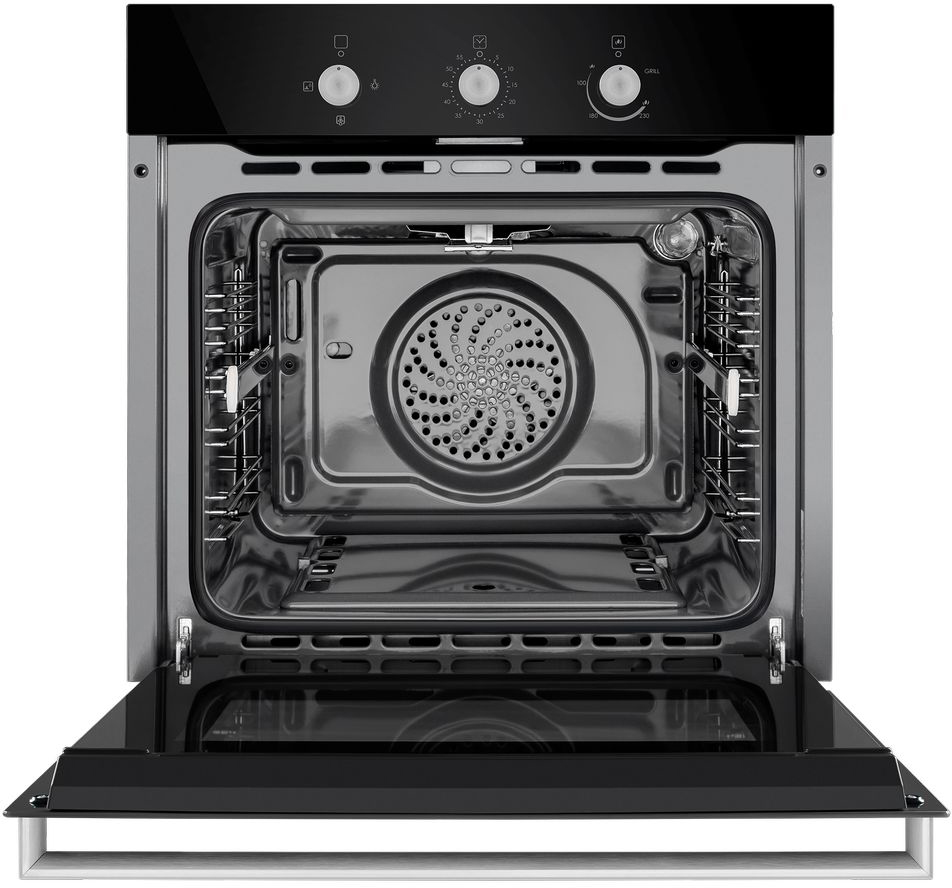 Фронтальная панель духовки выполнена из высококачественного жаропрочного тонированного стекла черного цвета. Ручка дверцы, сделанная из матированной нержавеющей стали, не нагревается в процессе готовки.