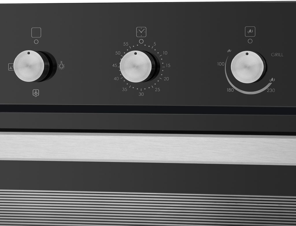 Механическое управление осуществляется цельнометаллическими поворотными ручками. Можно выбрать режим работы, температуру и установить таймер (0-60 мин). В данной модели поддерживается 4 режима работы: нижний газовый нагрев с вентилятором, традиционная готовка, газовый гриль, освещение. Данный тип газового духового шкафа имеет отличительную характеристику – работает как при открытом, так и при закрытом гриле.