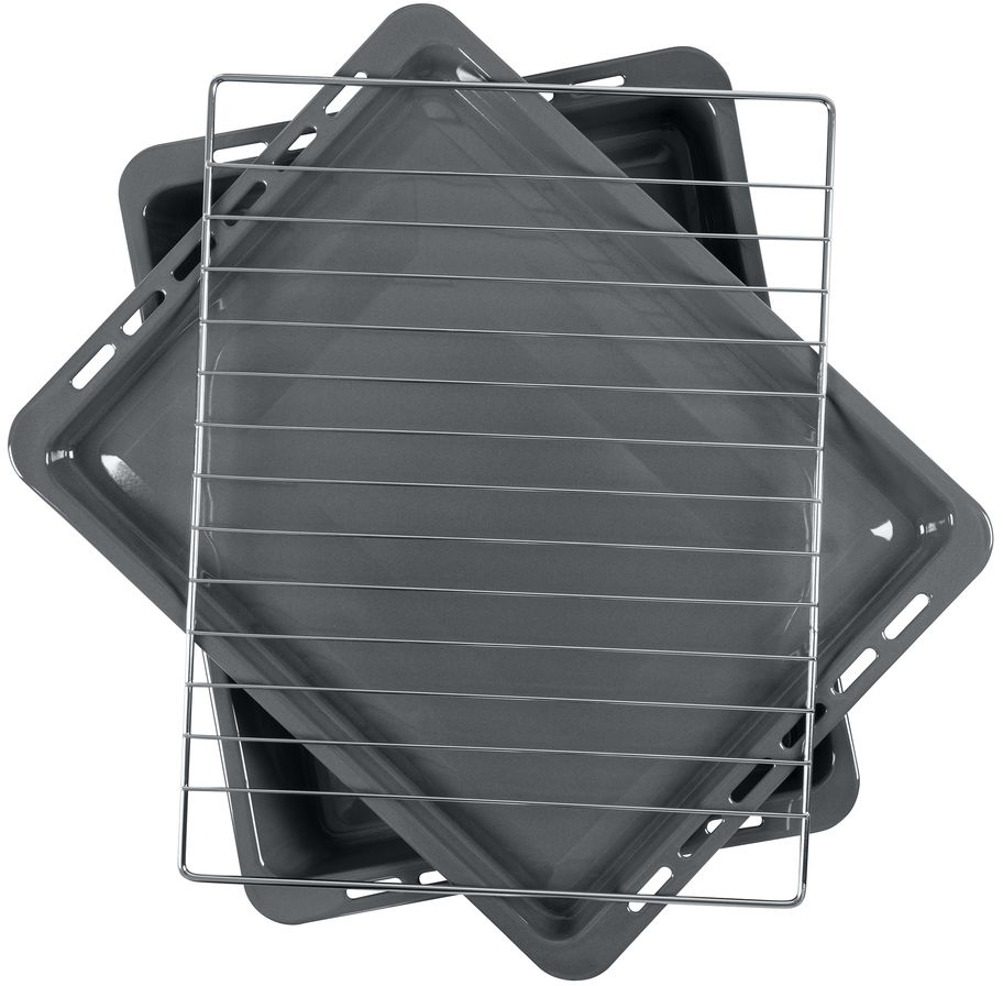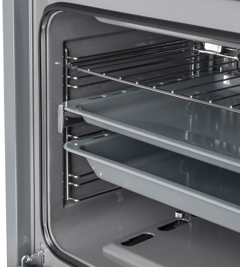 Объем 67 л при стандартной ширине 60 см позволяет готовить одновременно несколько блюд, разместив решетку или противень на одном из 5-ти уровней боковых направляющих. Один уровень оснащен удобными телескопическими направляющими. Внутреннее покрытие камеры выполнено из специальной легкоочищающейся эмали серого цвета.