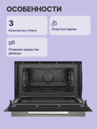 Дверца SoftClose и SoftOpen — еще одно значительное преимущество этой модели. Открытие и закрытие духовки происходят плавно и бесшумно, что не только улучшает общий комфорт при использовании, но и служит дополнительной защитой от случайных повреждений или травм, особенно в домах с маленькими детьми.