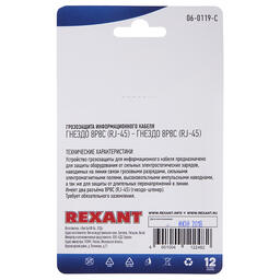 Устройство грозозащиты для информационного кабеля предназначено для защиты оборудования от сильных электростатических зарядов, наводимых на линии связи грозовыми разрядами, сильными электромагнитными полями, высоковольтными импульсными наводками, а так же для защиты от длительных перенапряжений в линии. Имеет два разъёма 8Р8С (Rj-45) (гнездо-штекер). Требует обязательного заземления.