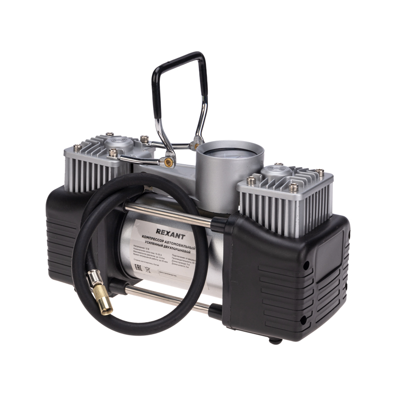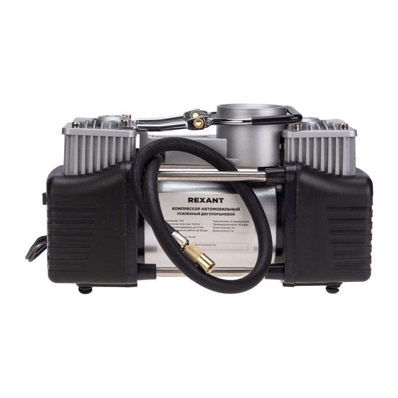 Компрессор автомобильный, металлический усиленный, двухпоршневой, 60 л/мин, с питанием от АКБ автомобиля, в кейсе с набором инструментов REXANT. Используется для накачки автомобильных шин легковых автомобилей, кроссоверов, внедорожников и малого коммерческого транспорта.
