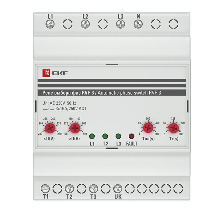 Реле выбора фаз RVF-3 EKF PROxima используется для питания однофазной нагрузки 230В/50(60) Гц от трехфазной четырехпроводной (пятипроводной) сети. Реле переключает питание однофазного потребителя в зависимости от наличия и качества фазного напряжения на проводниках L1, L2 и L3. Наиболее приоритетным является питание нагрузки от фазного проводника L1 менее приоритетным от L3, при нормальных параметрах напряжения на всех фазах,реле подключит нагрузку от приоритетной фазы (L1). Если на приоритетной фазе значение напряжения выходит за пределы порогов срабатывания, то прибор переключает нагрузку на другую фазу. Если напряжение на резервных фазах не соответствует выставленным порогам срабатывания, то нагрузка отключается
