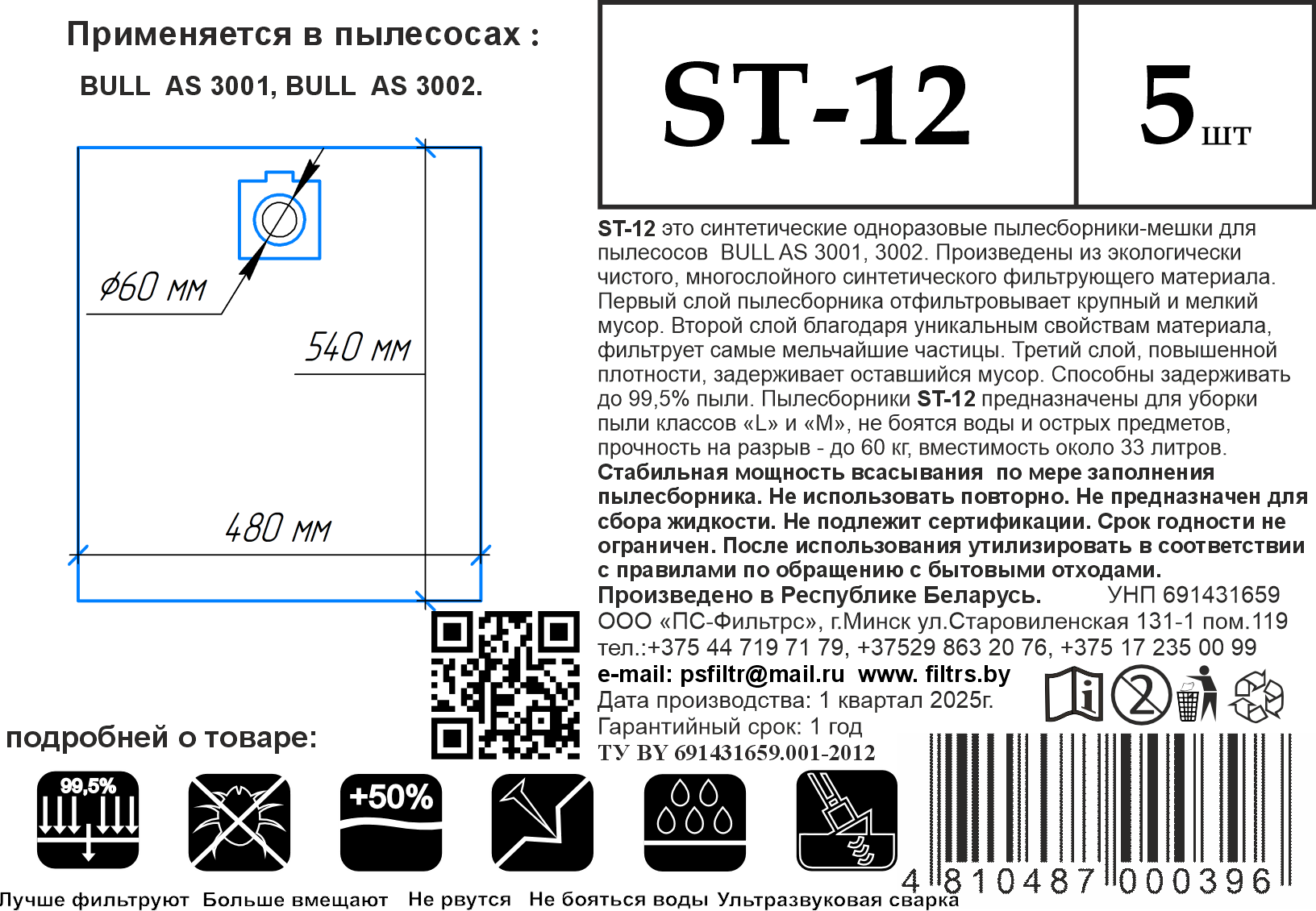 Комплект пылесборников для пылесоса ПС-Фильтрс ST-12