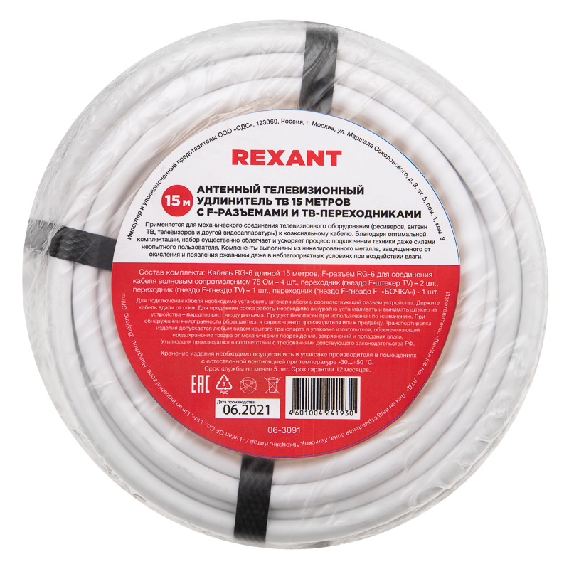 В состав комплекта входят: кабель RG-6 CCS 75Ом длиной 15 метров; F-разъем RG-6 – 4 шт; переходник (гнездо F - штекер TV) – 2 шт; переходник (гнездо F - гнездо TV) – 1 шт; переходник (гнездо F - гнездо F Бочка) – 1 шт.
