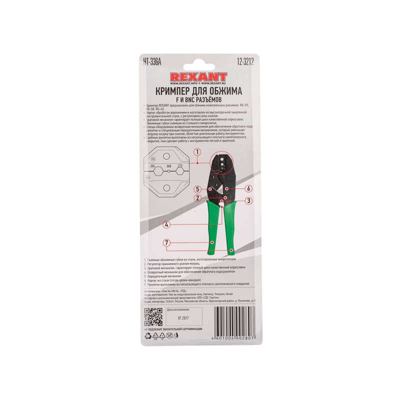 Кримпер REXANT HT-301 A для обжима F и BNC разъемов предназначен для обжима коаксиальных разъемов RG-59, RG-58, RG-62. Особенности:- Корпус с регулятором силы сжатия изготовлен из высокопрочной закаленной инструментальной стали и обработан воронением. - Храповой механизм гарантирует полный цикл качественной опрессовки. - Обжимные съемные губки из стального микролитья.- Клещи оборудованы возвратным механизмом для обеспечения обратного хода рукояток и специальным передаточным механизмом, который уменьшает нагрузку на руку при сжатии, облегчая длительную работу инструментом. - Эргономичные рукоятки покрыты нескользящим резиновым покрытием, что сделает работу с инструментом легкой и приятной.