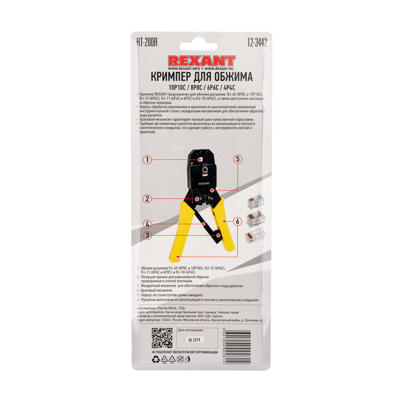 Кримпер REXANT HT-200R — универсальный инструмент для обжима разъемов RJ-45 (8P8C и 10P10C), RJ-12 (6P6C), RJ-11 (6P4C и 6P2C) и RJ-10 (4P4C), а также для снятия изоляции и обрезки проводов. Особенности:- Режущая кромка для равномерной обрезки проводов и снятия изоляции.- Корпус выполнен из высокопрочной хром-ванадиевой стали, обработан воронением.- Возвратный механизм для обеспечения обратного хода рукояток.- Храповой механизм гарантирует полный цикл качественной опрессовки.- Удобные рукоятки с нескользящим плотным синтетическим покрытием сделают работу с инструментом легкой и приятной.