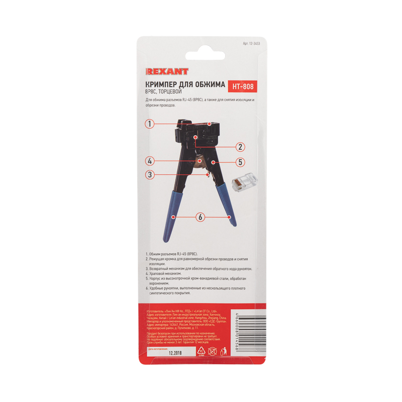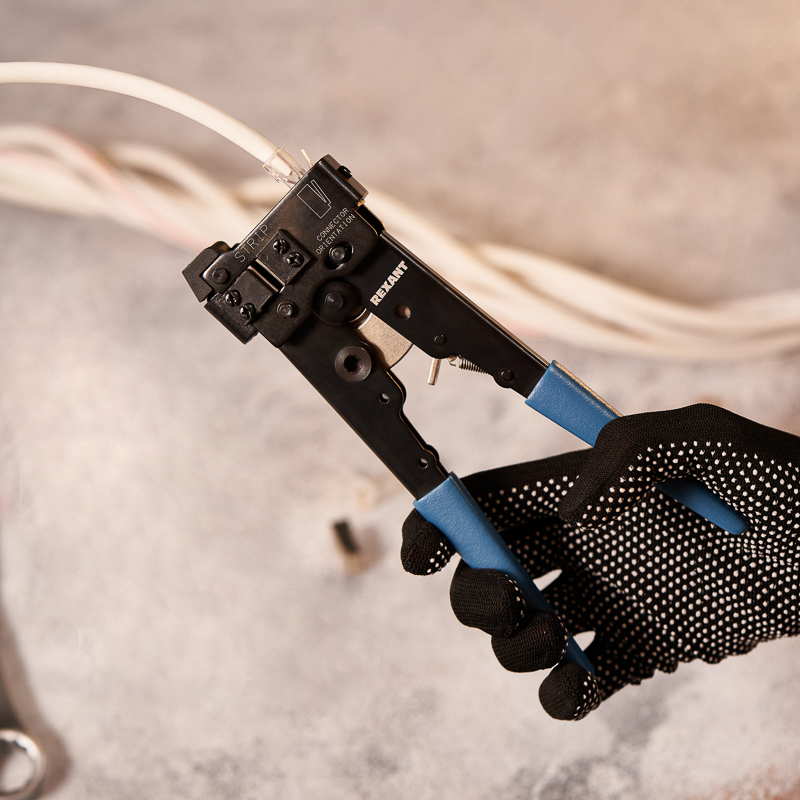 Кримпер REXANT HT-808 PROFI универсальный инструмент для обжима разъемов RJ-45 (8P8C), а также для снятия изоляции и обрезки проводов. Особенности:- Корпус выполнен из качественной инструментальной стали с воронением.- Равномерное распределение обжимного давления по всей матрице при опрессовке разъема. - Корпус с возвратным механизмом для обеспечения обратного хода рукояток. - Храповой механизм гарантирует полный цикл качественной опрессовки. - Удобные рукоятки с нескользящим плотным синтетическим покрытием сделают работу с инструментом легкой и приятной.