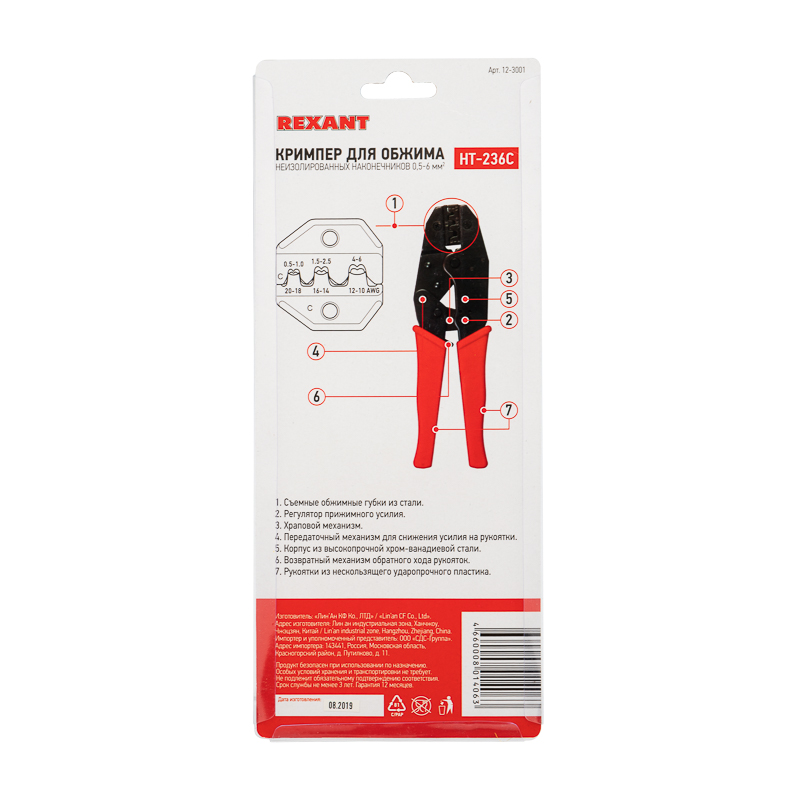 Кримпер REXANT HT-236C – универсальный инструмент для обжима неизолированных клемм с диапазоном 0.5-6.0 мм². Особености:- Корпус выполнен из высокопрочной закаленной инструментальной стали с воронением.- Двухконтурная матрица позволяет совершать обжим как по изоляции, так и по жиле.- Регулятор позволяет контролировать прижимное усилие матриц.- Храповой механизм гарантирует полный цикл качественной опрессовки.- Съемные обжимные губки из стали, изготовленные микролитьем.- Специальный передаточный механизм уменьшает нагрузку на руку при сжатии.- Возвратный механизм для обеспечения обратного хода рукояток.- Эргономичные рукоятки покрыты нескользящим резиновым покрытием, что сделает работу с инструментом легкой и приятной.