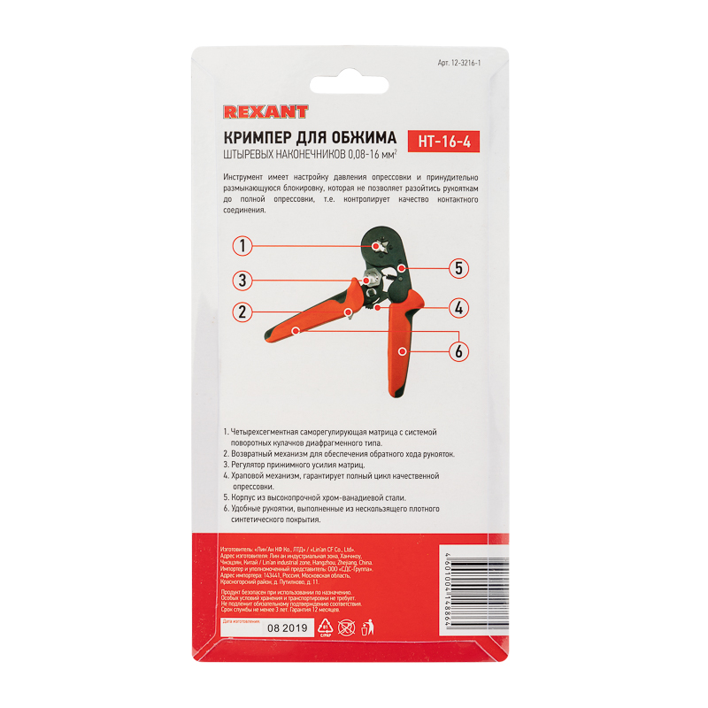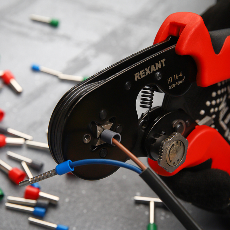 Кримпер REXANT HT 16-4 предназначен для опрессовки, практически, всего ряда штыревых наконечников в диапазоне 0.08-16.0 мм². Особенности:- Четырехсегментная саморегулирующая матрица с системой поворотных кулачков диафрагменного типа выполняет квадратный профиль обжима с рифлением. - Есть настройка давления опрессовки и принудительно размыкающаяся блокировка, которая не позволяет разойтись рукояткам до полной опрессовки и контролирует качество контактного соединения.- Кримпер дополнен регулятором прижимного усилия с 6 положениями:– для опрессовки наконечников малых сечений на провода 0.08–6 мм² (выполняется поворот против часовой стрелки);– для опрессовки наконечников больших сечений на провод 10 и 16 мм² (выполняется поворот по часовой стрелке);- Инструмент перекрывает диапазон обжима из 18 размеров втулочных наконечников.