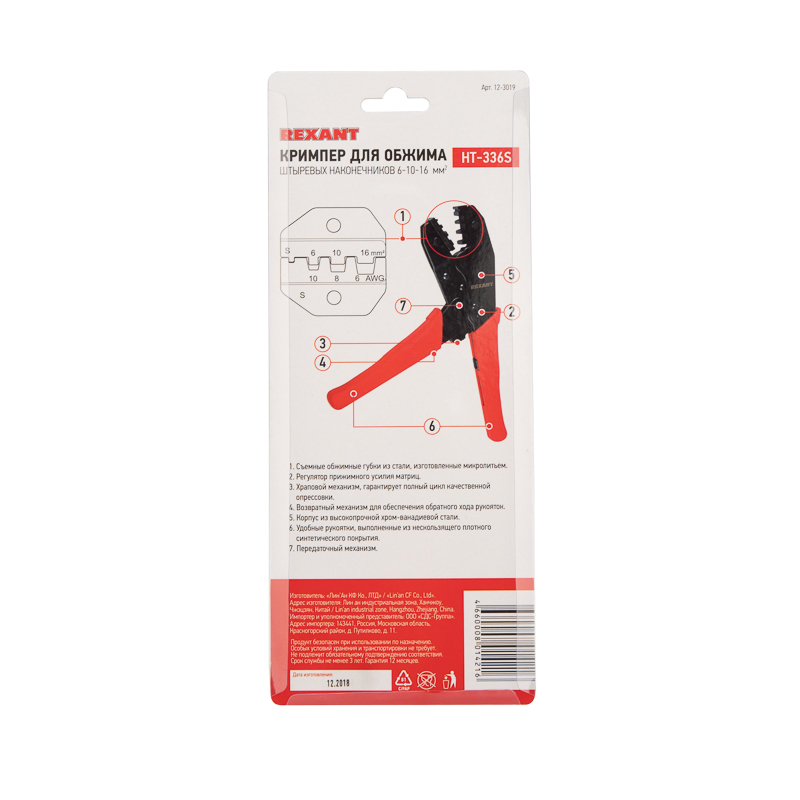Кримпер REXANT HT-301 S – универсальный инструмент для обжима клемм с диапазоном 6.0-10.0-16.0 мм². Особенности:- Корпус выполнен из закаленной инструментальной стали. - Регулятор прижимного усилия матриц делает работу более продуктивной. - Храповой механизм гарантирует полный цикл качественной опрессовки. - Съемные губки из стального микролитья. - Клещи оборудованы специальным передаточным механизмом, который уменьшает нагрузку на руку при сжатии, облегчая длительную работу инструментом. Удобные рукоятки с нескользящим плотным синтетическим покрытием сделают работу с инструментом легкой и приятной.
