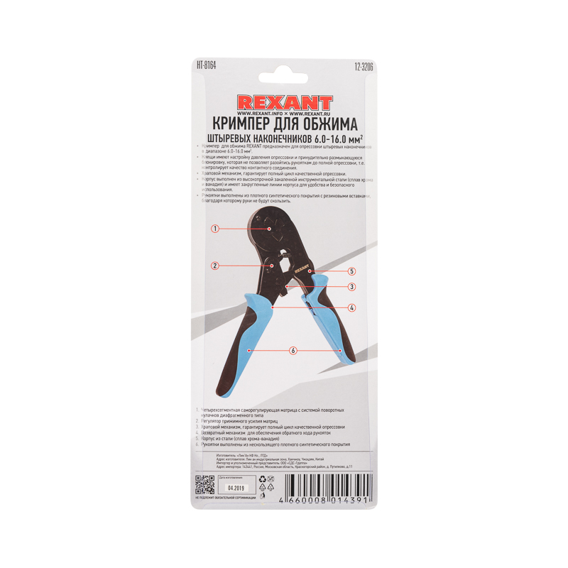 Кримпер REXANT HT-8164 предназначен для обжима штыревых наконечников в диапазоне 6.0-16.0 мм². Особенности:- Корпус выполнен из высокопрочной закаленной инструментальной стали (сплав хрома и ванадия) и имеет закругленные линии корпуса для удобства и безопасного использования.- Четырехсегментная саморегулирующая матрица с системой поворотных кулачков диафрагменного типа.- Клещи имеют настройку давления опрессовки и принудительно размыкающуюся блокировку, которая не позволяет разойтись рукояткам до полной опрессовки, т. е. контролирует качество контактного соединения.- Храповой механизм, гарантирует полный цикл качественной опрессовки.- Рукоятки выполнены из плотного синтетического покрытия с резиновыми вставками, благодаря которому руки не будут скользить.