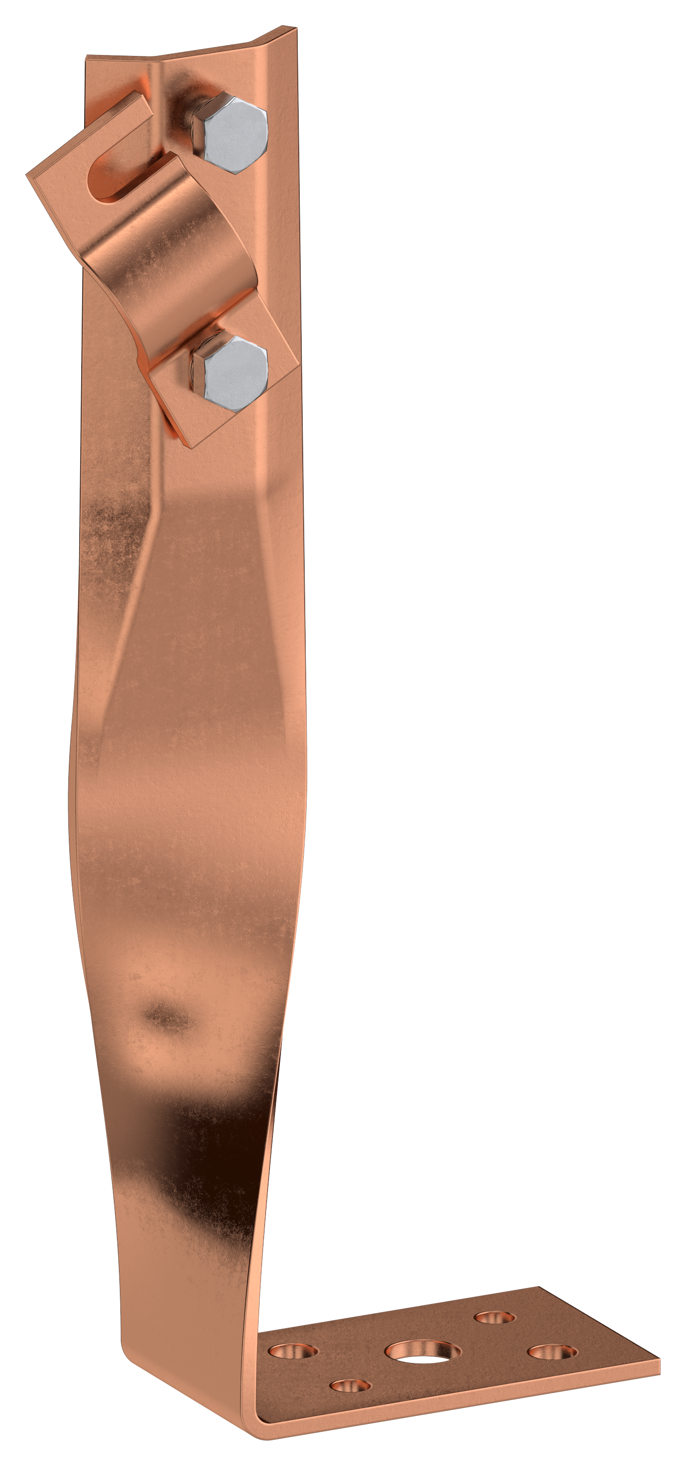 Держатель угловой скрученный с болтовым зажимом предназначен для монтажа проводника на горизонтальные, вертикальные или наклонные поверхности. Скрученная конструкция держателя позволяет крепить проводник на узкие парапеты.