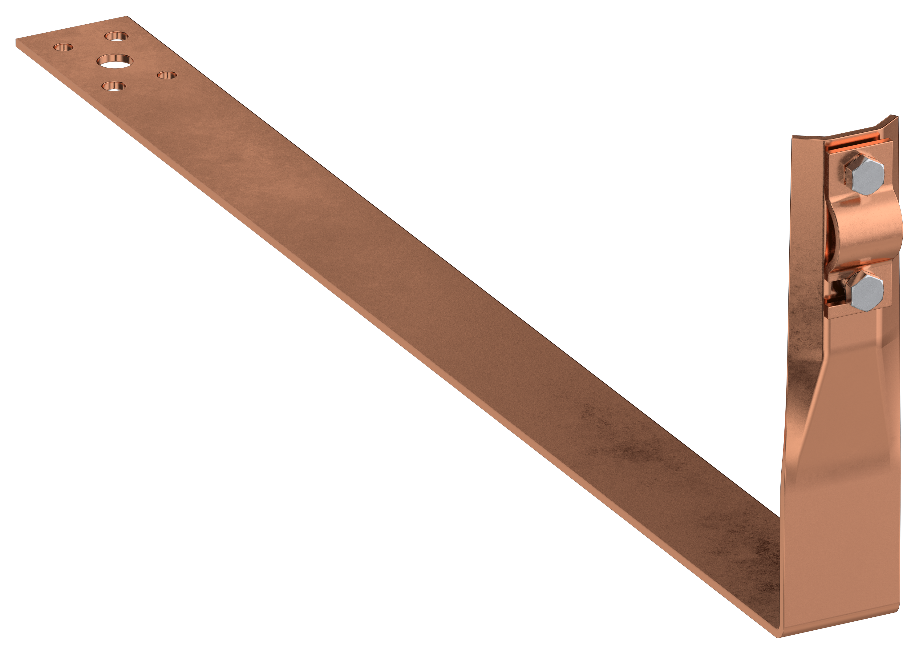 Держатель проводника круглого для черепичной кровли с болтовым зажимом предназначен для закрепления прутка на черепичной, мягкой и шиферной кровле. Держатель крепится к рейкам крыши при помощи метизов. Фиксация проводника происходит при помощи болтового соединения перпендикулярно длинной стороне держателя. Материал корпуса - медь.