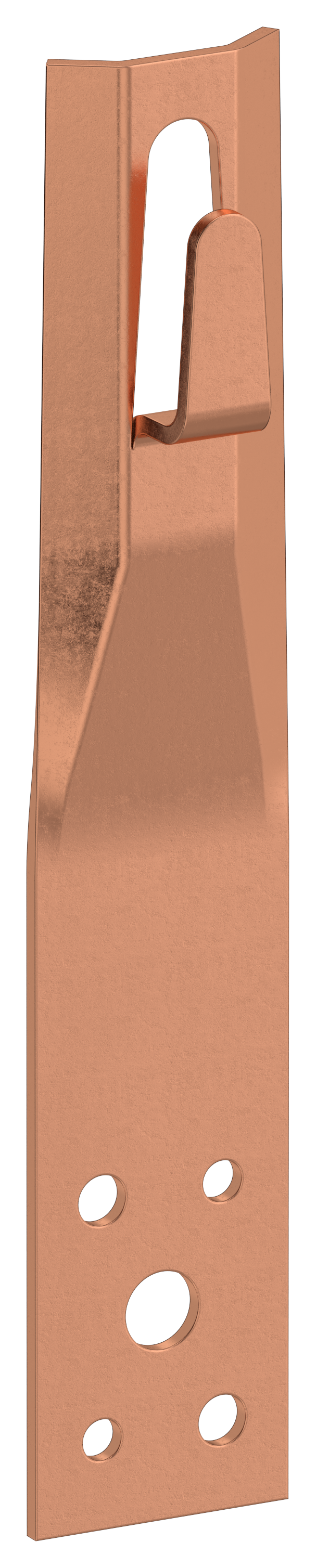 Монтируется на поверхности при помощи метизов. Фиксация проводника происходит при помощи зажима в «язычке» держателя. Материал корпуса - медь.