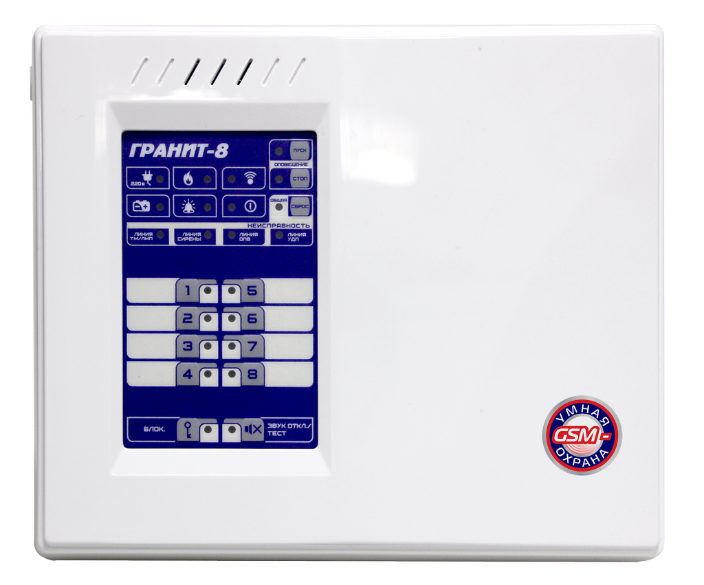 Прибор приемно-контрольный Гранит-8А, 8 зон, автодозвон, GSM-сигнализация (2 SIM-карты+ГТС), речевые сообщения, РИП, программирование через ПК (USB).