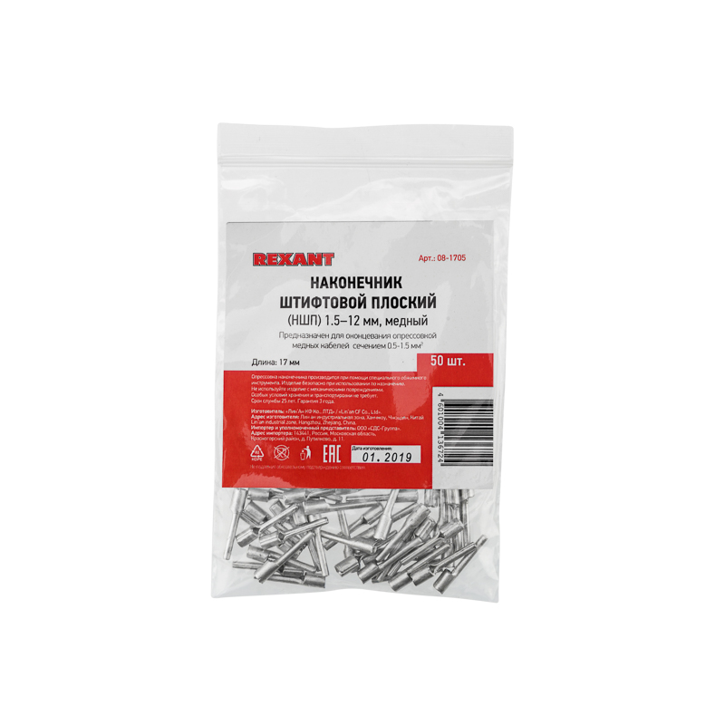 Наконечник кабельный медный штифтовой плоский (НШП) 1.5 –12 (номинальное сечение наконечника мм²; длина контактной части мм).Назначение: для оконцевания опрессовкой медных кабелей сечением 0.5-1.5 мм²Длина каконечника (L): 17 ммМатериал: электротехническая медьПокрытие: специальное олово-висмутовое, обеспечивающее защиту от коррозии и гарантирующее высокое качество соединения при любых погодно-климатических условиях.Сварной шов на участке контактного скругления под кабельную жилу делает трубную часть монолитной и гарантирует надежность опрессовки.Плоский штифт имеет рельефные насечки, обеспечивающие надежную фиксацию в прижимной клемме. Соединитель одного типоразмера возможно использовать на несколько сечений жил кабеля.Используются для подключения к выводам автоматических выключателей и прочим электрическим устройствам с ограниченной шириной контактной клеммы.