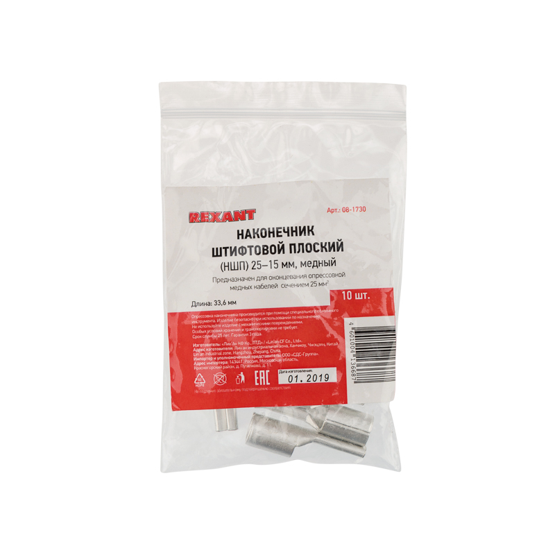 Наконечник кабельный медный штифтовой плоский (НШП) 25–15 (номинальное сечение наконечника мм²; длина контактной части мм).Назначение: для оконцевания опрессовкой медных кабелей сечением 25 мм²Длина каконечника (L): 33,6 ммМатериал: электротехническая медьПокрытие: специальное олово-висмутовое, обеспечивающее защиту от коррозии и гарантирующее высокое качество соединения при любых погодно-климатических условиях.Сварной шов на участке контактного скругления под кабельную жилу делает трубную часть монолитной и гарантирует надежность опрессовки.Плоский штифт имеет рельефные насечки, обеспечивающие надежную фиксацию в прижимной клемме. Соединитель одного типоразмера возможно использовать на несколько сечений жил кабеля.Используются для подключения к выводам автоматических выключателей и прочим электрическим устройствам с ограниченной шириной контактной клеммы.