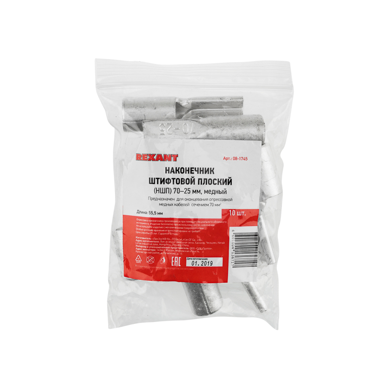 Наконечник кабельный медный штифтовой плоский (НШП) 70–25 (номинальное сечение наконечника мм²; длина контактной части мм).Назначение: для оконцевания опрессовкой медных кабелей сечением 70 мм²Длина каконечника (L): 55,5 ммМатериал: электротехническая медьПокрытие: специальное олово-висмутовое, обеспечивающее защиту от коррозии и гарантирующее высоко6 качество соединения при любых погодно-климатических условиях.Сварной шов на участке контактного скругления под кабельную жилу делает трубную часть монолитной и гарантирует надежность опрессовки.Плоский штифт имеет рельефные насечки, обеспечивающие надежную фиксацию в прижимной клемме. Соединитель одного типоразмера возможно использовать на несколько сечений жил кабеля.Используются для подключения к выводам автоматических выключателей и прочим электрическим устройствам с ограниченной шириной контактной клеммы.