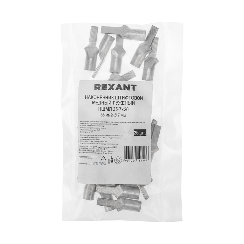 Наконечник штифтовой НШМЛ 35-7х20 (35 мм² - Ø7мм) REXANT предназначен для подключения проводников к автоматическим выключателям и к электрическим устройствам с зауженной шириной контактной площадки.Выполнен из высококачественной меди с лужением.Структура обозначения:Н — наконечник Ш — штифтовойМ — Медь — материал, из которого изготовлен наконечникЛ — Луженая — покрытие35 — номинальное сечение наконечника, мм²7 — диаметр контактного стержня, мм20— длина контактной части, мм