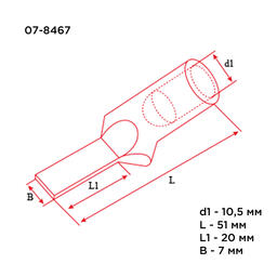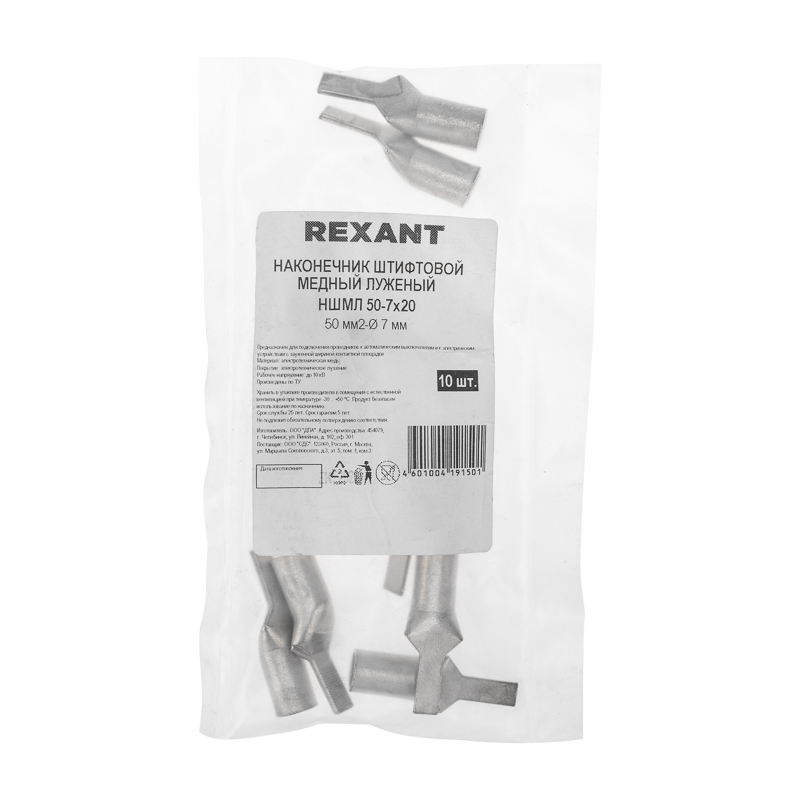 Наконечник штифтовой НШМЛ 50-7х20 (50 мм² - Ø7мм) REXANT предназначен для подключения проводников к автоматическим выключателям и к электрическим устройствам с зауженной шириной контактной площадки.Выполнен из высококачественной меди с лужением.Структура обозначения:Н — наконечник Ш — штифтовойМ — Медь — материал, из которого изготовлен наконечникЛ — Луженая — покрытие50— номинальное сечение наконечника, мм²7 — диаметр контактного стержня, мм20— длина контактной части, мм
