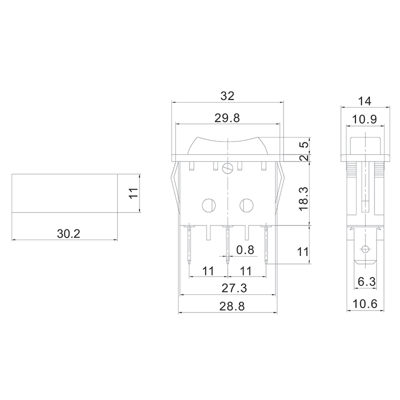 Выключатель клавишный 250V 10А (3с) ON-OFF-ON черный с нейтралью.