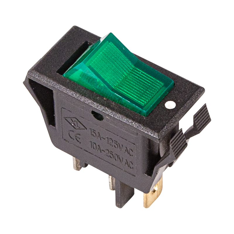 Выключатель клавишный 250V 15А (3с) ON-OFF зеленый с подсветкой предназначен для коммутации электрических цепей переменного тока напряжением до 250В. Клавишные (Рокерные) выключатели применяются в качестве комплектующих изделий различного электрооборудования (в сетевых фильтрах и удлинителях, аудио-оборудовании, блоках питания, электроустановках на различных производствах, автомобилях, и многих других местах). Такой клавишный переключатель имеет два положения. Принцип действия основан на перемещении клавиши в одну из позиций. Для переключения в нужное положение требуется приложить некоторые усилия на клавишу. Монтаж осуществляется без применения винтов на плоских панелях толщиной от 0.8мм до 3мм. Подключение контактов осуществляется плоской клеммой 6.6мм, либо с помощью пайки.Основные характеристики:Номинальное напряжение: 250В;Предельное напряжение: 1500VАС не более 1 минуты;Номинальный ток: 15A (250VAC);Контактное сопротивление: не более 35 мОм;Тип переключения: ON-OFF;Количество контактных групп: 1;Количество контактов в контактной группе: 3;Фиксация положений: да;Индикатор коммутационных положений: зеленый;Рабочая температура: от -25℃ до +85℃;Ресурс: 10 000 циклов.