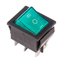 Выключатель клавишный 250V 15А (6с) ON-OFF-ON зеленый с подсветкой и нейтралью предназначен для коммутации электрических цепей переменного тока напряжением до 250В. Клавишные (Рокерные) выключатели применяются в качестве комплектующих изделий различного электрооборудования (в сетевых фильтрах и удлинителях, аудио-оборудовании, блоках питания, электроустановках на различных производствах, автомобилях, и многих других местах). Такой клавишный переключатель имеет три положения. Принцип действия основан на перемещении клавиши в одну из позиций. Для переключения в нужное положение требуется приложить некоторые усилия на клавишу. Монтаж осуществляется без применения винтов на плоских панелях толщиной от 0.8мм до 3мм. Подключение контактов осуществляется плоской клеммой 6.6мм, либо с помощью пайки.Основные характеристики:Номинальное напряжение: 250В;Предельное напряжение: 1500VАС не более 1 минуты;Номинальный ток: 15A (250VAC);Контактное сопротивление: не более 35 мОм;Тип переключения: ON-OFF-ON;Количество контактных групп: 2;Количество контактов в контактной группе: 3;Фиксация положений: да;Индикатор коммутационных положений: зеленый;Рабочая температура: от -25℃ до +85℃;Ресурс: 10 000 циклов.