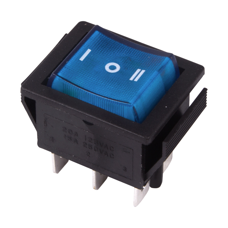 Выключатель клавишный 250V 15А (6с) ON-OFF-ON синий с подсветкой и нейтралью предназначен для коммутации электрических цепей переменного тока напряжением до 250В. Клавишные (Рокерные) выключатели применяются в качестве комплектующих изделий различного электрооборудования (в сетевых фильтрах и удлинителях, аудио-оборудовании, блоках питания, электроустановках на различных производствах, автомобилях, и многих других местах). Такой клавишный переключатель имеет три положения. Принцип действия основан на перемещении клавиши в одну из позиций. Для переключения в нужное положение требуется приложить некоторые усилия на клавишу. Монтаж осуществляется без применения винтов на плоских панелях толщиной от 0.8мм до 3мм. Подключение контактов осуществляется плоской клеммой 6.6мм, либо с помощью пайки.Основные характеристики:Номинальное напряжение: 250В;Предельное напряжение: 1500VАС не более 1 минуты;Номинальный ток: 15A (250VAC);Контактное сопротивление: не более 35 мОм;Тип переключения: ON-OFF-ON;Количество контактных групп: 2;Количество контактов в контактной группе: 3;Фиксация положений: да;Индикатор коммутационных положений: синий;Рабочая температура: от -25℃ до +85℃;Ресурс: 10 000 циклов.