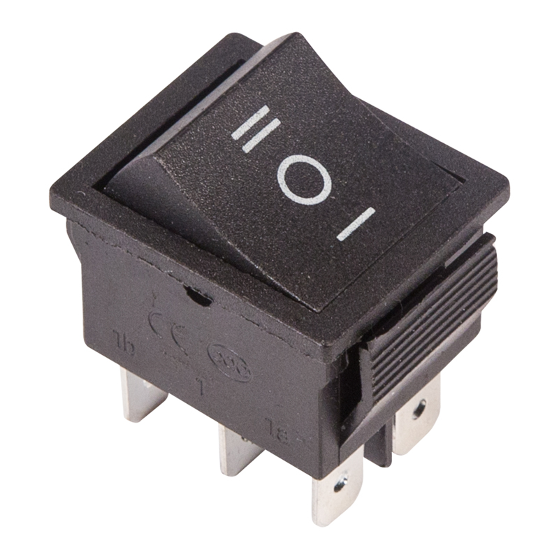 Выключатель клавишный 250V 15А (6с) ON-OFF-ON черный с нейтралью предназначен для коммутации электрических цепей переменного тока напряжением до 250В. Клавишные (Рокерные) выключатели применяются в качестве комплектующих изделий различного электрооборудования (в сетевых фильтрах и удлинителях, аудио-оборудовании, блоках питания, электроустановках на различных производствах, автомобилях, и многих других местах). Такой клавишный переключатель имеет три положения. Принцип действия основан на перемещении клавиши в одну из позиций. Для переключения в нужное положение требуется приложить некоторые усилия на клавишу. Монтаж осуществляется без применения винтов на плоских панелях толщиной от 0.8мм до 3мм. Подключение контактов осуществляется плоской клеммой 6.6мм, либо с помощью пайки.Основные характеристики:Номинальное напряжение: 250В;Предельное напряжение: 1500VАС не более 1 минуты;Номинальный ток: 15A (250VAC);Контактное сопротивление: не более 35 мОм;Тип переключения: ON-OFF-ON;Количество контактных групп: 2;Количество контактов в контактной группе: 3;Фиксация положений: да;Индикатор коммутационных положений: отсутствует;Рабочая температура: от -25℃ до +85℃;Ресурс: 10 000 циклов.