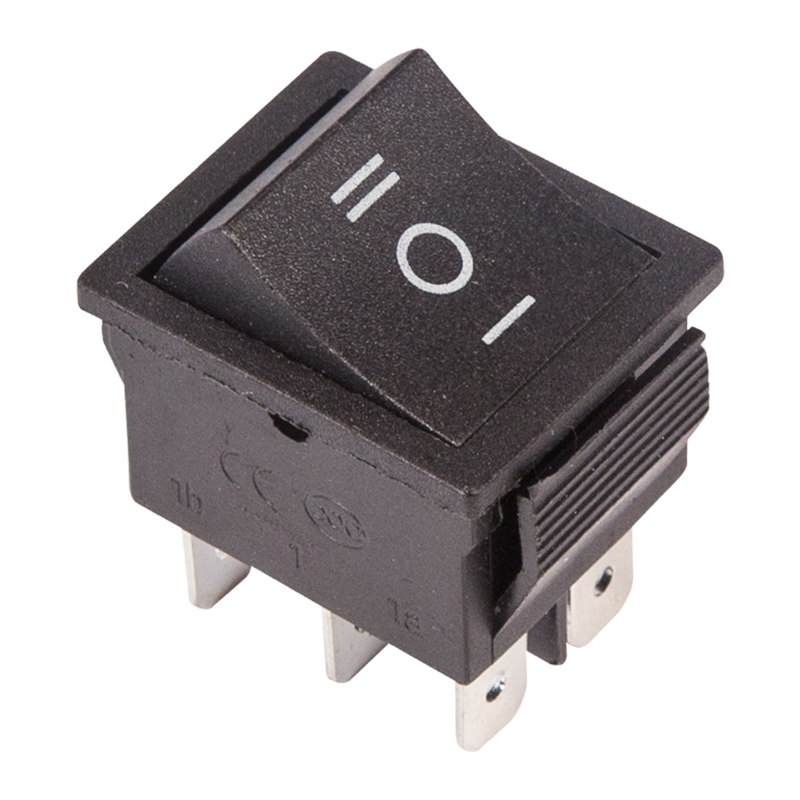 Выключатель клавишный 250V 15А (6с) ON-OFF-ON черный с нейтралью (RWB-508, SC-767) предназначен для коммутации электрических цепей переменного тока напряжением до 250В. Клавишные (Рокерные) выключатели применяются в качестве комплектующих изделий различного электрооборудования (в сетевых фильтрах и удлинителях, аудио-оборудовании, блоках питания, электроустановках на различных производствах, автомобилях, и многих других местах). Такой клавишный переключатель имеет три положения. Принцип действия основан на перемещении клавиши в одну из позиций. Для переключения в нужное положение требуется приложить некоторые усилия на клавишу. Монтаж осуществляется без применения винтов на плоских панелях толщиной от 0.8мм до 3мм. Подключение контактов осуществляется плоской клеммой 6.6мм, либо с помощью пайки.Основные характеристики:Номинальное напряжение: 250В;Предельное напряжение: 1500VАС не более 1 минуты;Номинальный ток: 15A (250VAC);Контактное сопротивление: не более 35 мОм;Тип переключения: ON-OFF-ON;Количество контактных групп: 2;Количество контактов в контактной группе: 3;Фиксация положений: да;Индикатор коммутационных положений: отсутствует;Рабочая температура: от -25℃ до +85℃;Ресурс: 10 000 циклов.