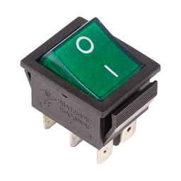 Выключатель клавишный 250V 15А (6с) ON-ON зеленый с подсветкой предназначен для коммутации электрических цепей переменного тока напряжением до 250В. Клавишные (Рокерные) выключатели применяются в качестве комплектующих изделий различного электрооборудования (в сетевых фильтрах и удлинителях, аудио-оборудовании, блоках питания, электроустановках на различных производствах, автомобилях, и многих других местах). Такой клавишный переключатель имеет два положения. Принцип действия основан на перемещении клавиши в одну из позиций. Для переключения в нужное положение требуется приложить некоторые усилия на клавишу. Монтаж осуществляется без применения винтов на плоских панелях толщиной от 0.8мм до 3мм. Подключение контактов осуществляется плоской клеммой 6.6мм, либо с помощью пайки.Основные характеристики:Номинальное напряжение: 250В;Предельное напряжение: 1500VАС не более 1 минуты;Номинальный ток: 15A (250VAC);Контактное сопротивление: не более 35 мОм;Тип переключения: ON-ON;Количество контактных групп: 2;Количество контактов в контактной группе: 3;Фиксация положений: да;Индикатор коммутационных положений: зеленый;Рабочая температура: от -25℃ до +85℃;Ресурс: 10 000 циклов.