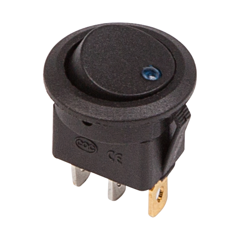 Выключатель клавишный круглый 12V 16А (3с) ON-OFF черный с синей подсветкой предназначен для коммутации электрических цепей. Клавишные (Рокерные) выключатели применяются в качестве комплектующих изделий различного электрооборудования (аудио-оборудовании, блоках питания, электроустановках на различных производствах, автомобилях, и многих других местах), с напряжением тока не более 12В. Такой клавишный переключатель имеет два положения. Принцип действия основан на перемещении клавиши в одну из позиций. Для переключения в нужное положение требуется приложить некоторые усилия на клавишу. Монтаж осуществляется без применения винтов на плоских панелях толщиной от 0.8мм до 3мм. Подключение контактов осуществляется плоской клеммой, либо с помощью пайки.Основные характеристики:Номинальное напряжение: 12В;Номинальный ток: 16A;Контактное сопротивление: не более 35 мОм;Тип переключения: ON-OFF;Количество контактных групп: 1;Количество контактов в контактной группе: 3;Фиксация положений: да;Индикатор коммутационных положений: синий;Рабочая температура: от -25℃ до +85℃;Ресурс: 10 000 циклов.